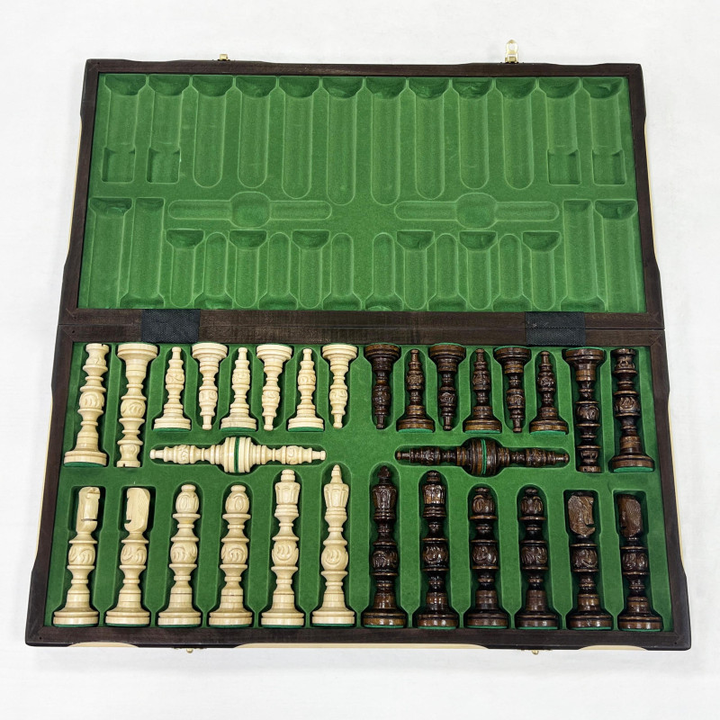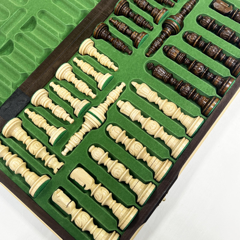 Доска также заслуживает отдельного внимания и комплиментов мастерам. Размер 56х56 см оптимален для комфортной игры дома. Доска изготавливается из липы, которая известна прочностью и долговечностью. Правильная обработка древесины также влияет на срок службы. Внутри доска оббита красивым материалом и в ней имеются ячейки для каждой фигуры, поэтому с переносом шахматных фигур проблем не возникает.