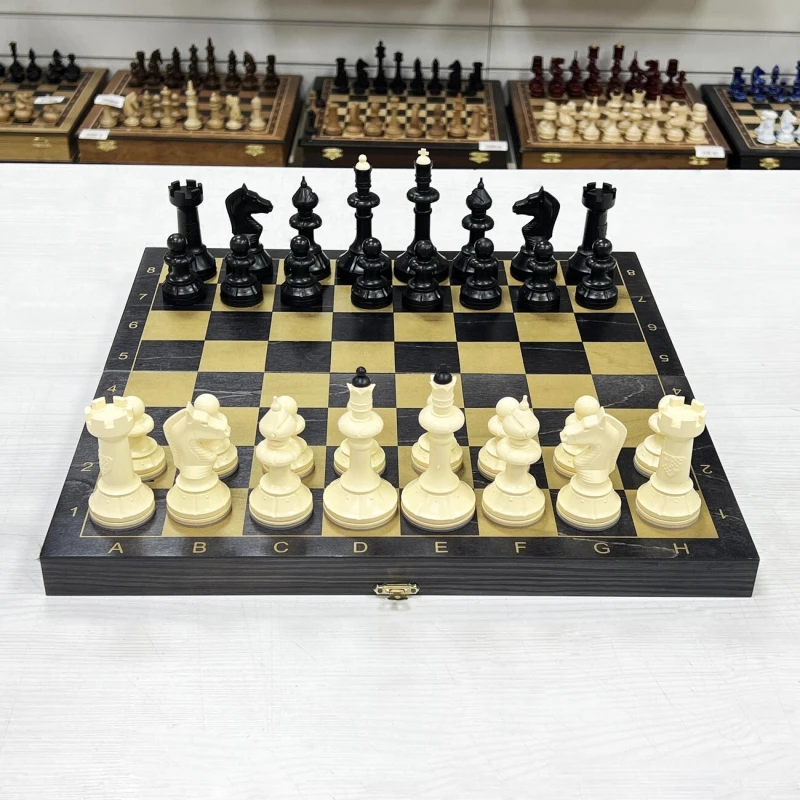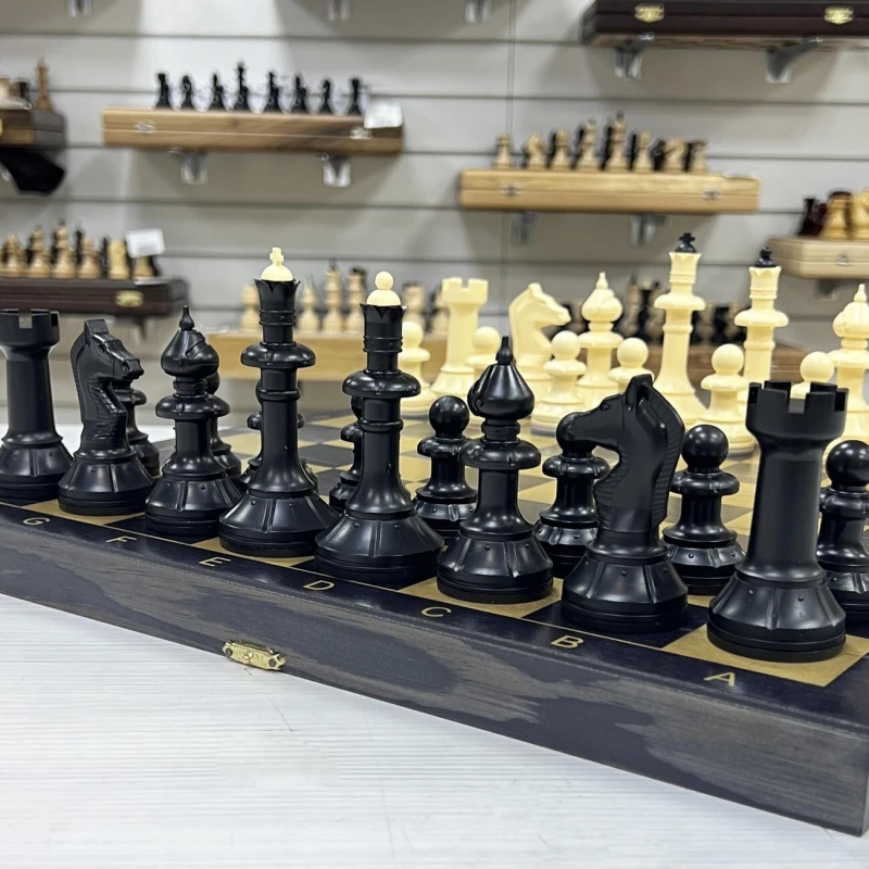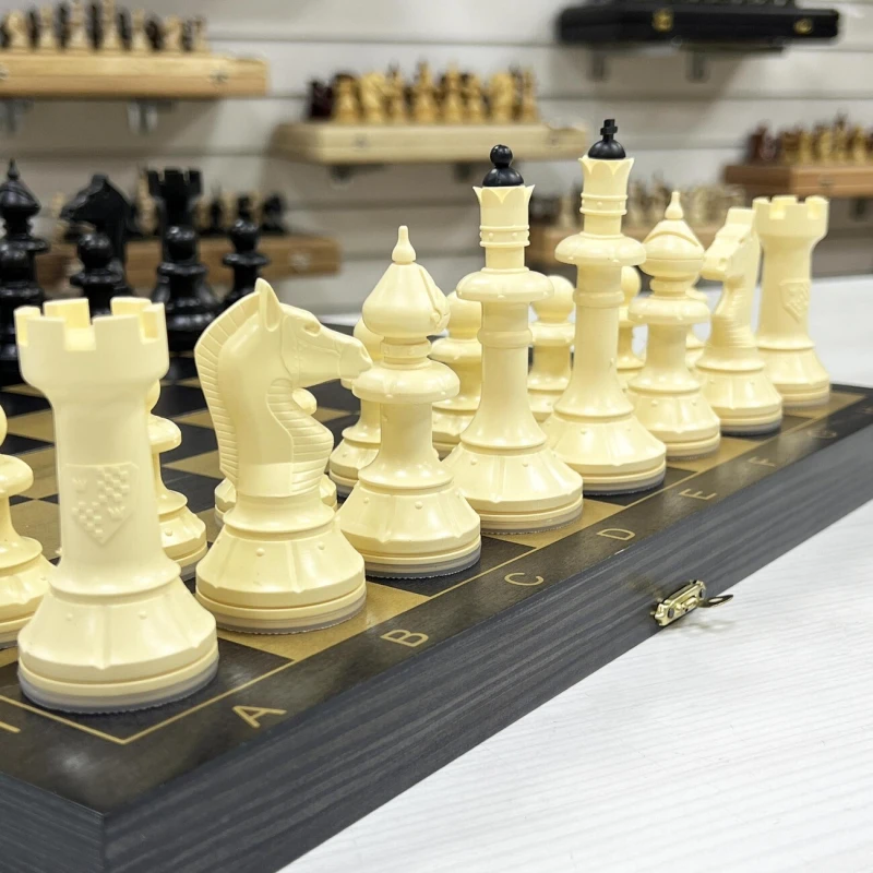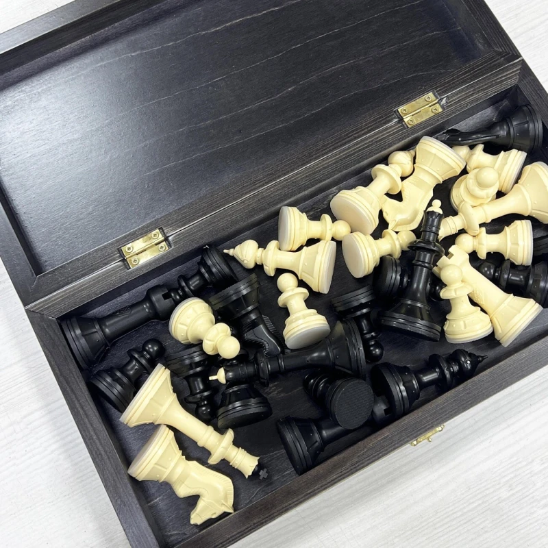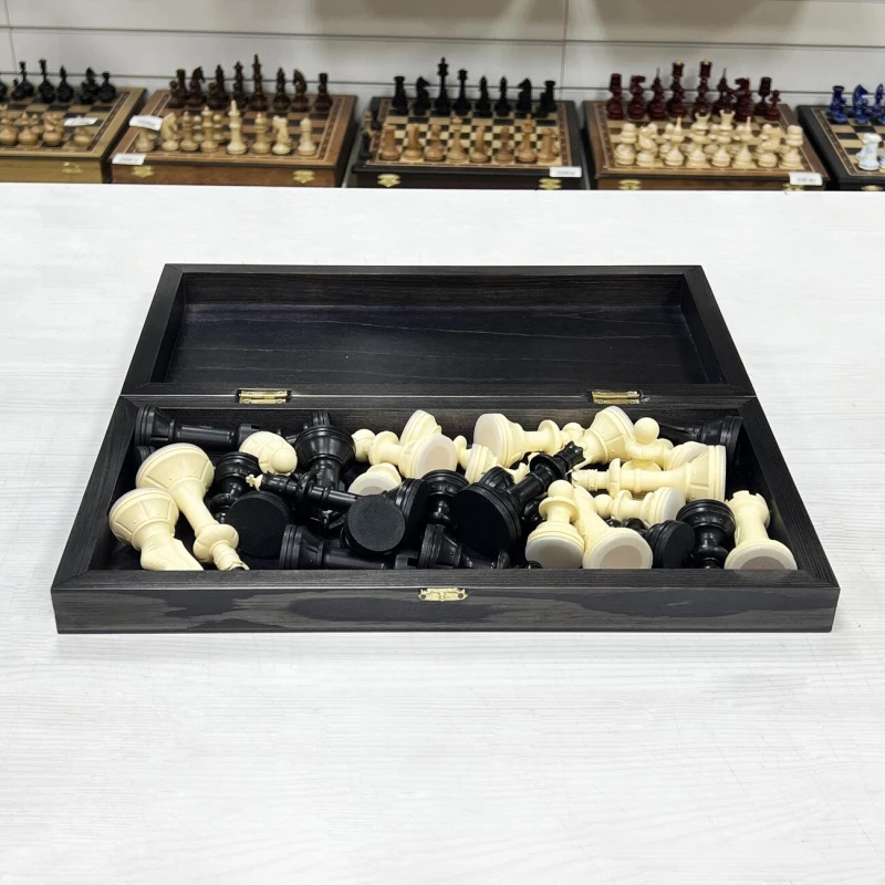 Материал шахматной доски тонированное дерево. Материал шахматных фигур пластик. Особенность шахматных фигур в том, что снизу есть достаточно много места для утяжеления. Подклейка у фигур аккуратно снимается и внутрь можно поместить например пластилин или песок для сильного утяжеления. Размер доски в разложенном виде 40 на 40 см. Высота короля 10 см, высота пешки. Подойдут в подарок для детей и взрослых.