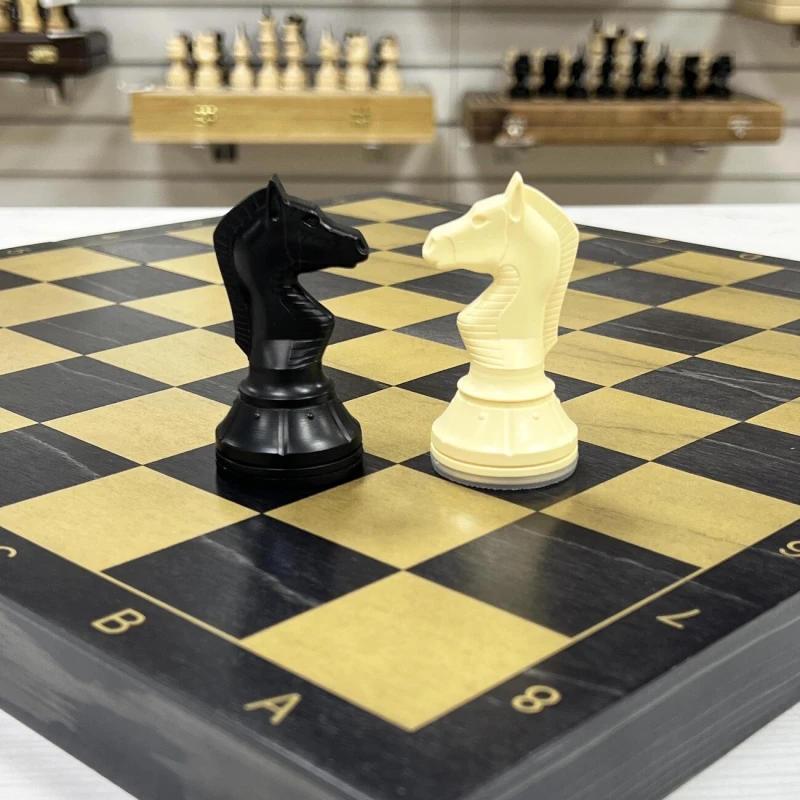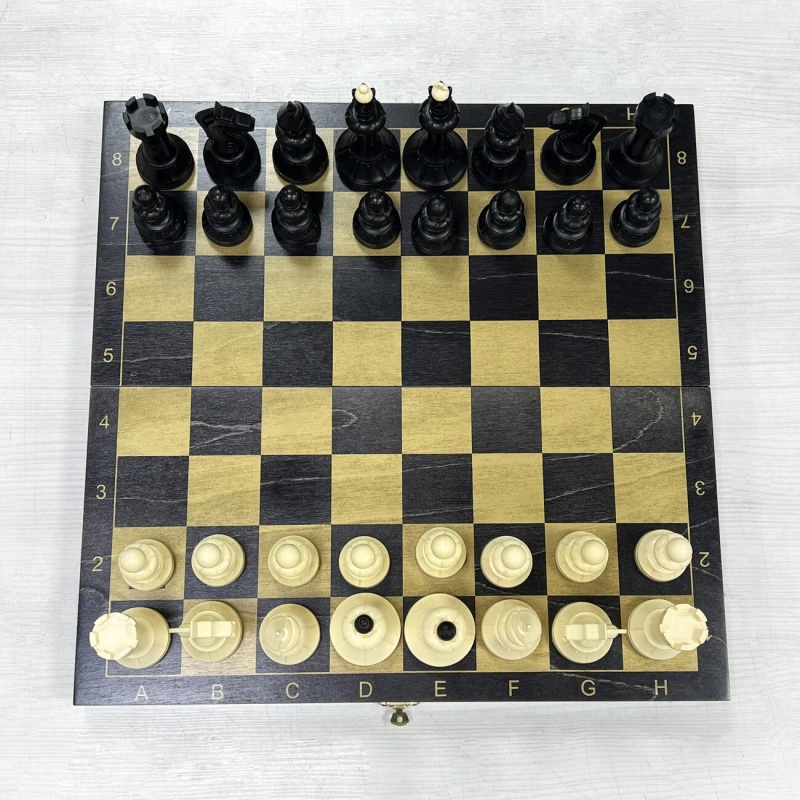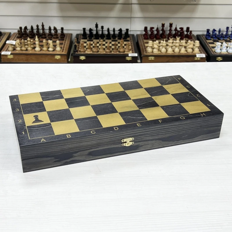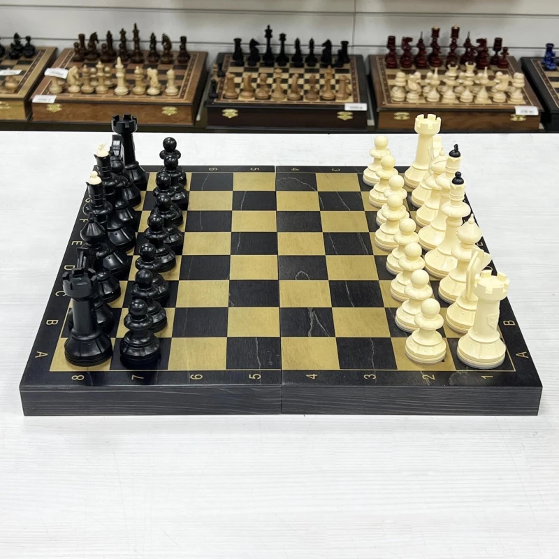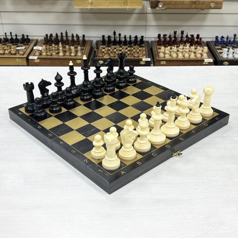 Материал шахматной доски тонированное дерево. Материал шахматных фигур пластик. Особенность шахматных фигур в том, что снизу есть достаточно много места для утяжеления. Подклейка у фигур аккуратно снимается и внутрь можно поместить например пластилин или песок для сильного утяжеления. Размер доски в разложенном виде 40 на 40 см. Высота короля 10 см, высота пешки. Подойдут в подарок для детей и взрослых.