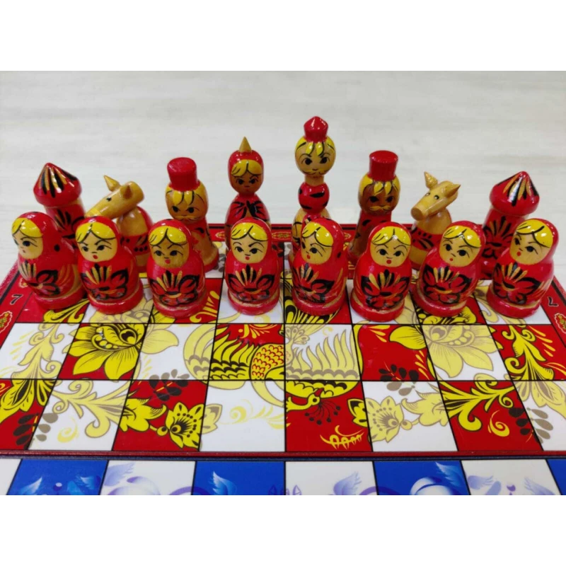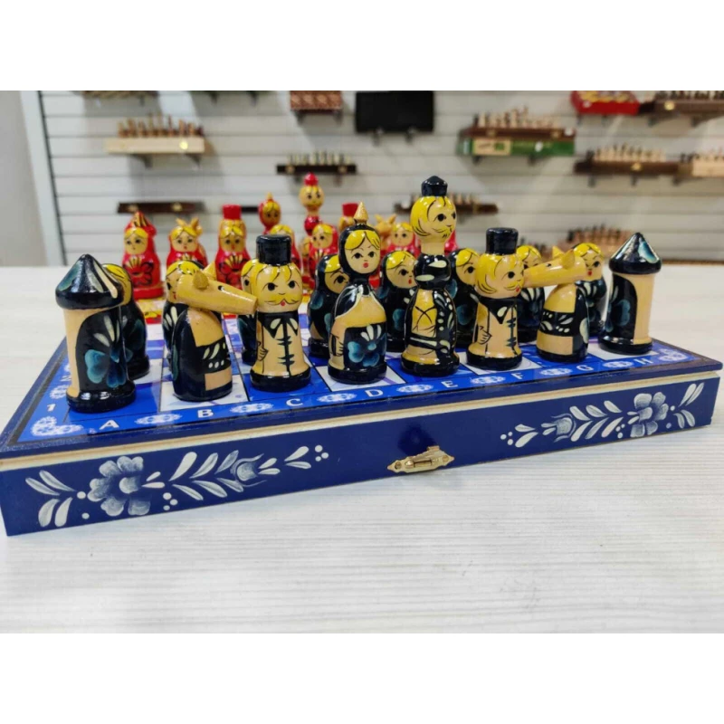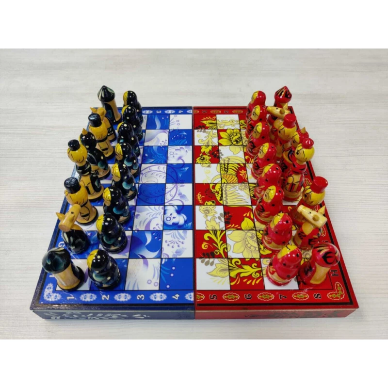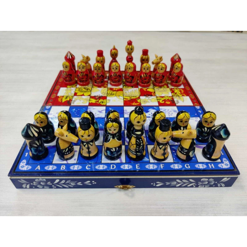 Сувенирные шахматы ручной работы из дерева. Размер доски 30 на 30 см в разложенном виде. Доска закрывается на 1 замок. Высота короля 8 см. Высота пешки 4.5 см
