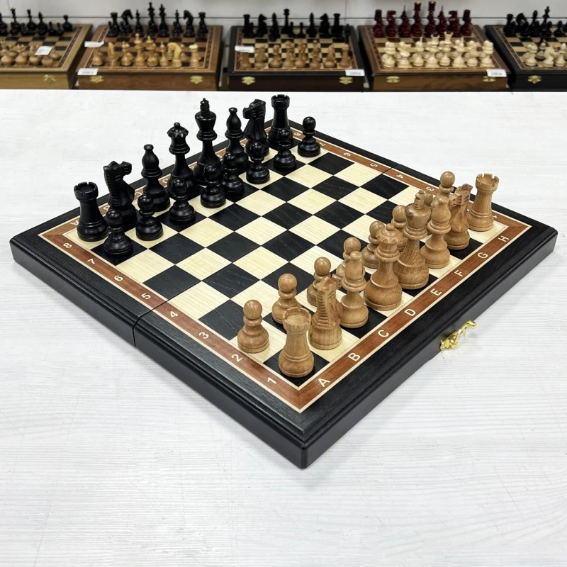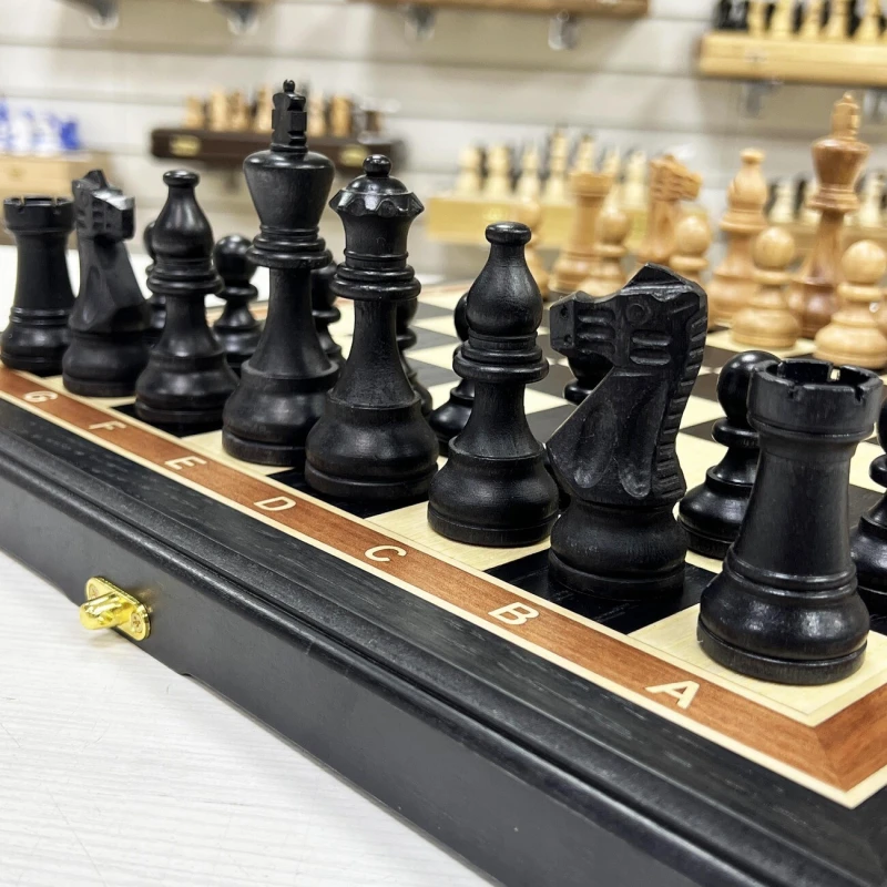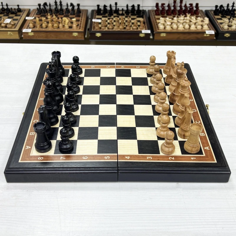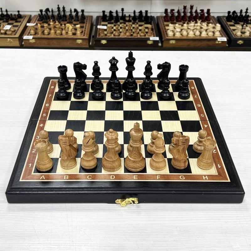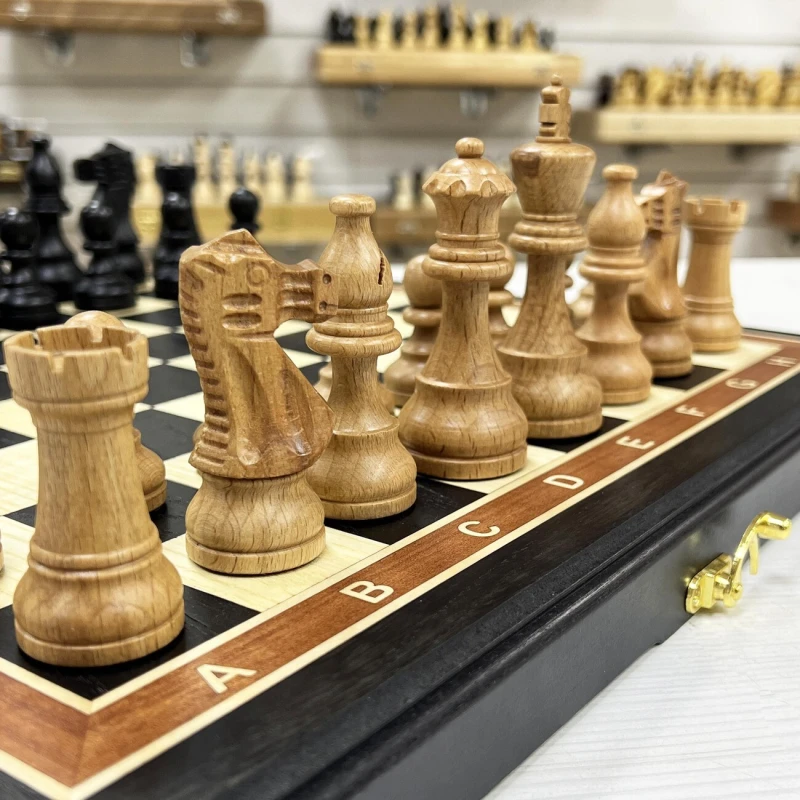 Турнирные шахматы из дерева в классическом исполнении Стаунтон ручной работы на доске складного типа выполенной в технике маркетри. Шахматная доска от края до края 40 на 40 см. Размер клетки 4 на 4 см. Шахматные фигуры с утяжелением. Купить шахматы можно в наших магазинах в Москве и Санкт Петербурге.