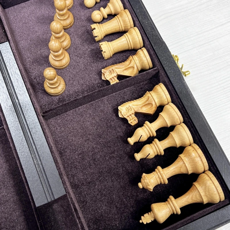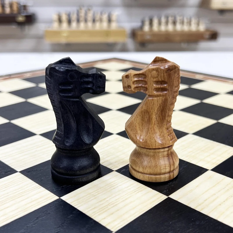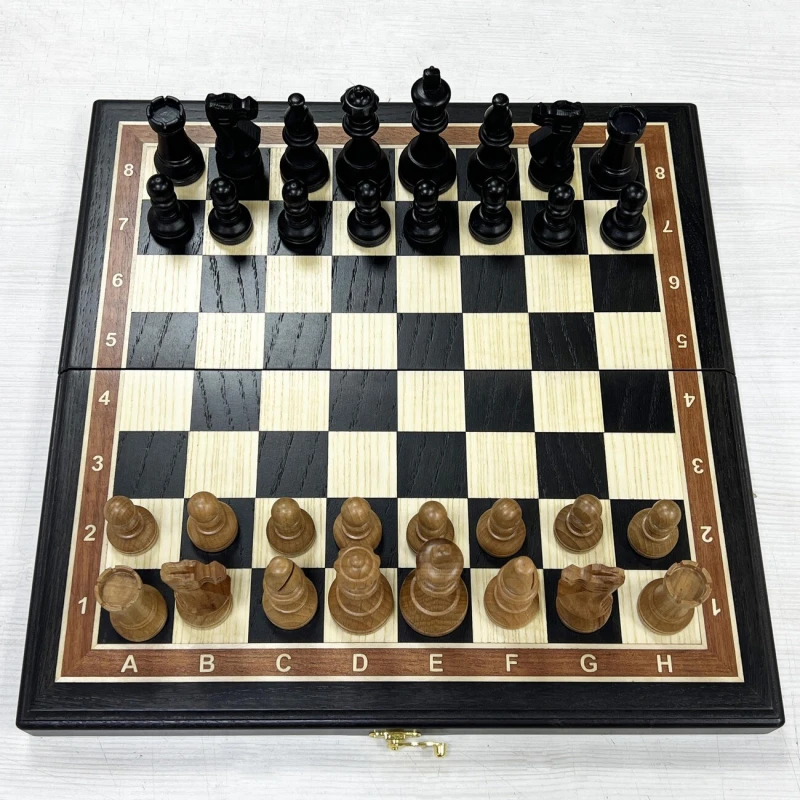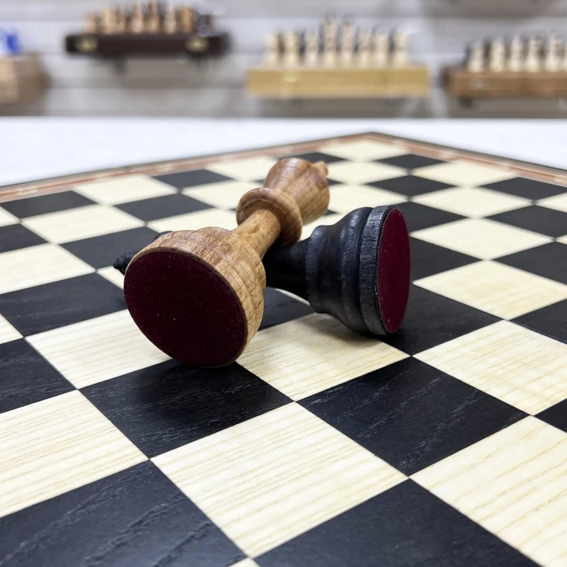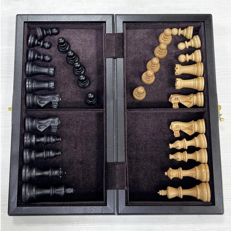 Турнирные шахматы из дерева в классическом исполнении Стаунтон ручной работы на доске складного типа выполенной в технике маркетри. Шахматная доска от края до края 40 на 40 см. Размер клетки 4 на 4 см. Шахматные фигуры с утяжелением. Купить шахматы можно в наших магазинах в Москве и Санкт Петербурге.