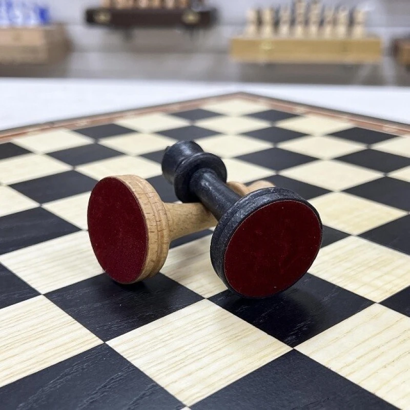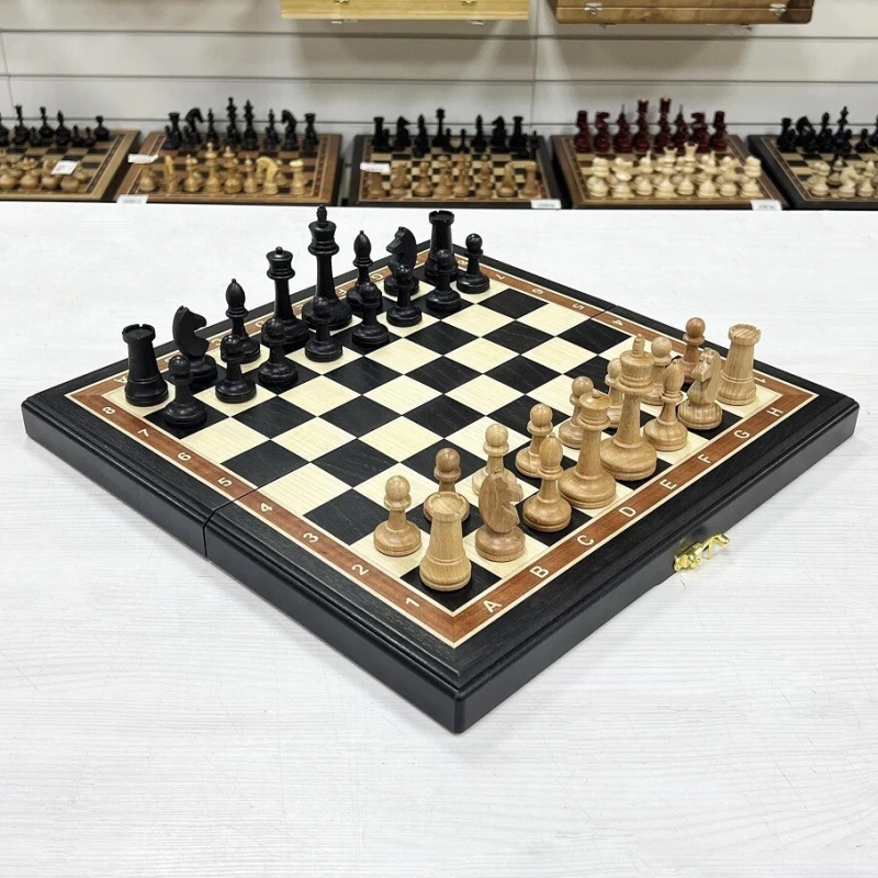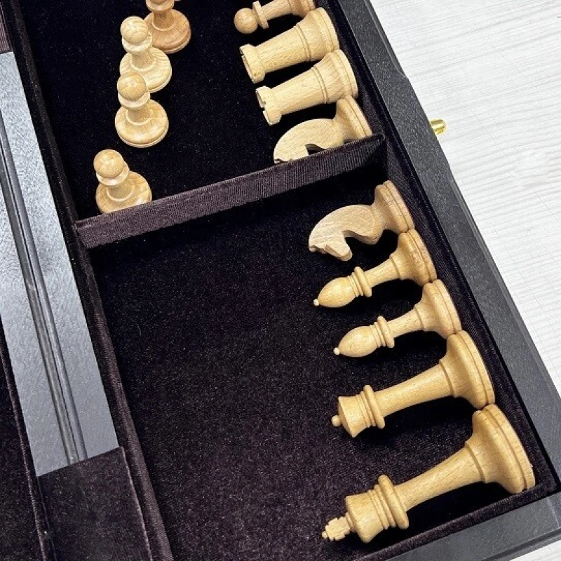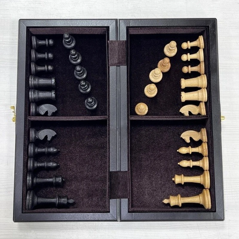 Размер доски в разложенном виде 40 на 40 см. Материал доски моренный дуб, ясень, тонированная береза. Шахматное поле собирается вручную из ценных пород дерева в технике маркетри. Шахматные фигуры достаточно простые , выполнены в стиле Стаунтон из бука с утяжелением. Внутри доска покрыта бархатом.