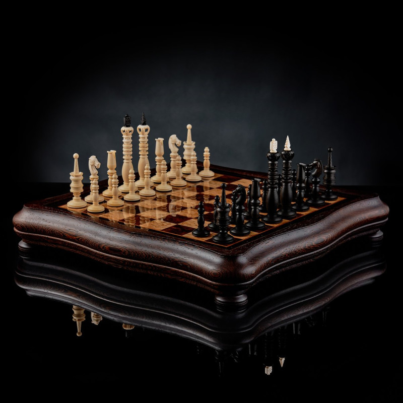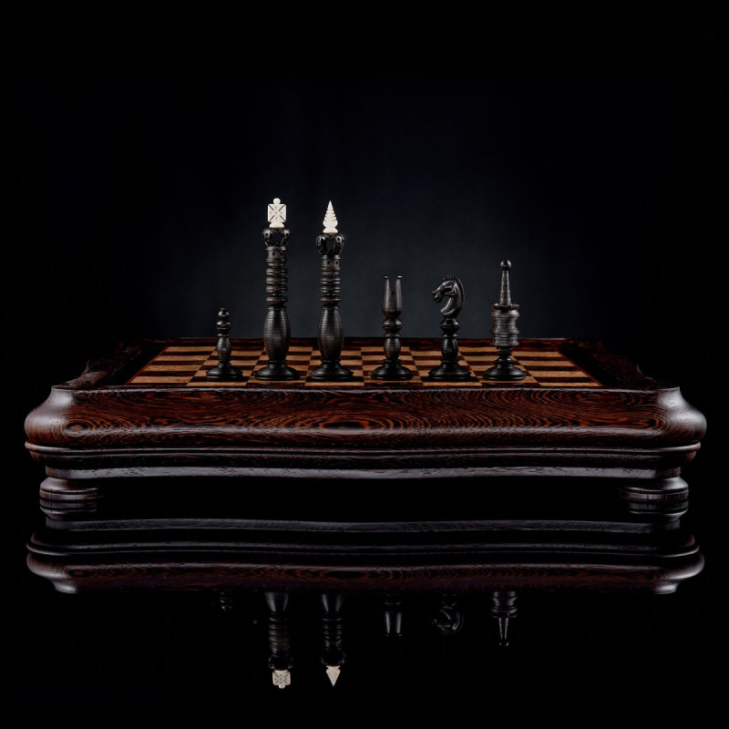 Каркас - массив африканского венге , клетка темная – корень американского ореха, клетка светлая – карельская береза, покрытие шахматного поля рояльным лаком, внутри мягкий ложемент с ячейками под каждую фигуру.