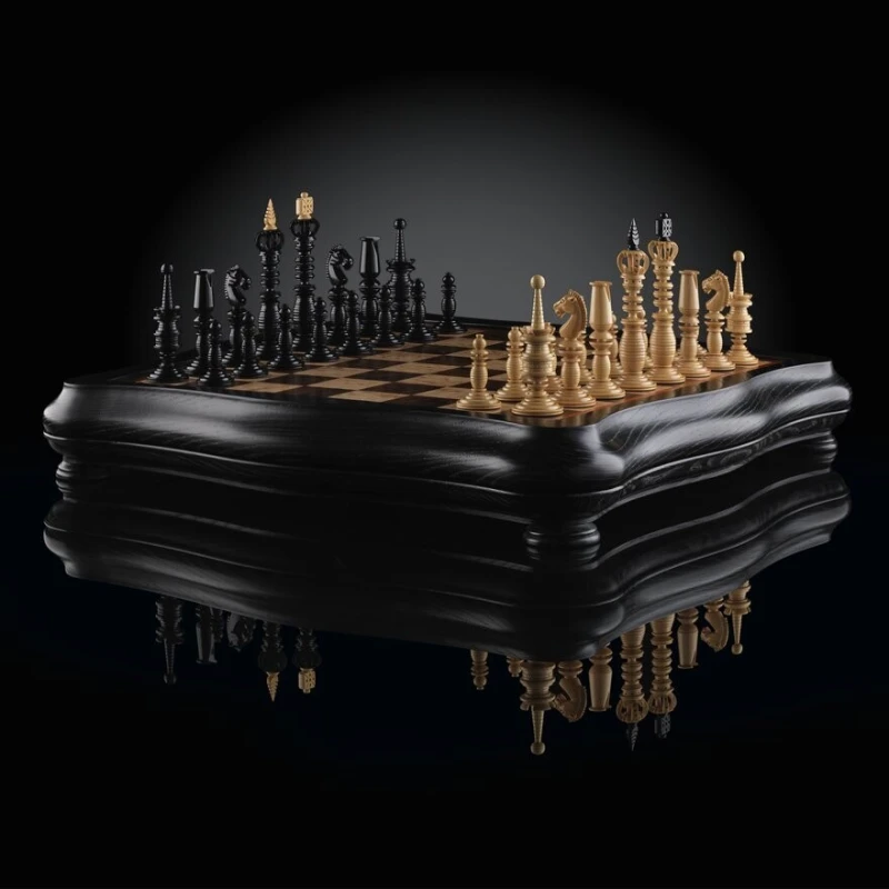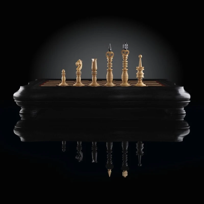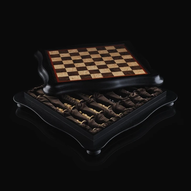конструкция доски со съемной верхней крышкой, мягкий ложемент из бархата с ячейками для каждой фигурки