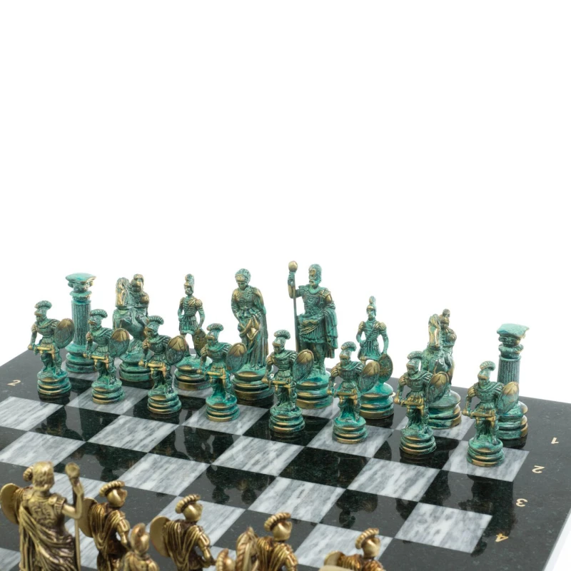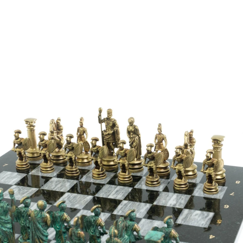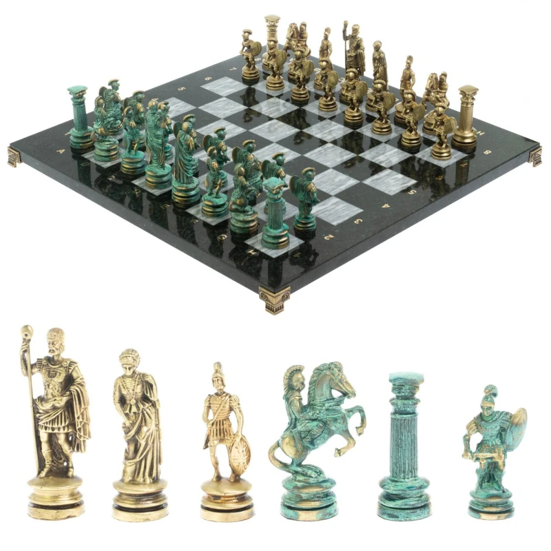 Набор для игры в шахматы "Древний Рим" изготовлен вручную, доска из натурального камня, шахматные фигуры металлические в цвете бронза и патина.
