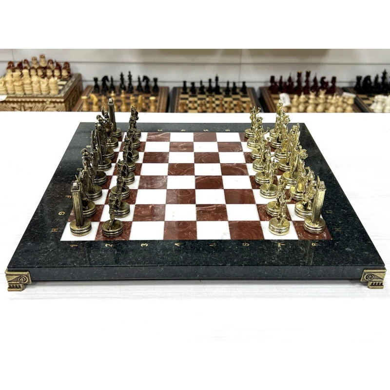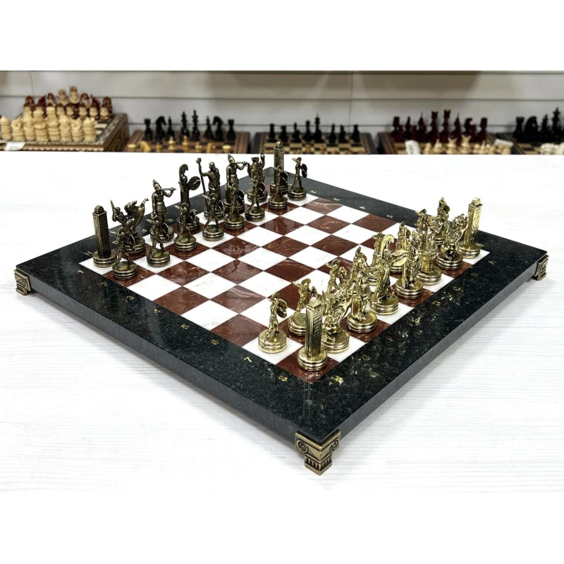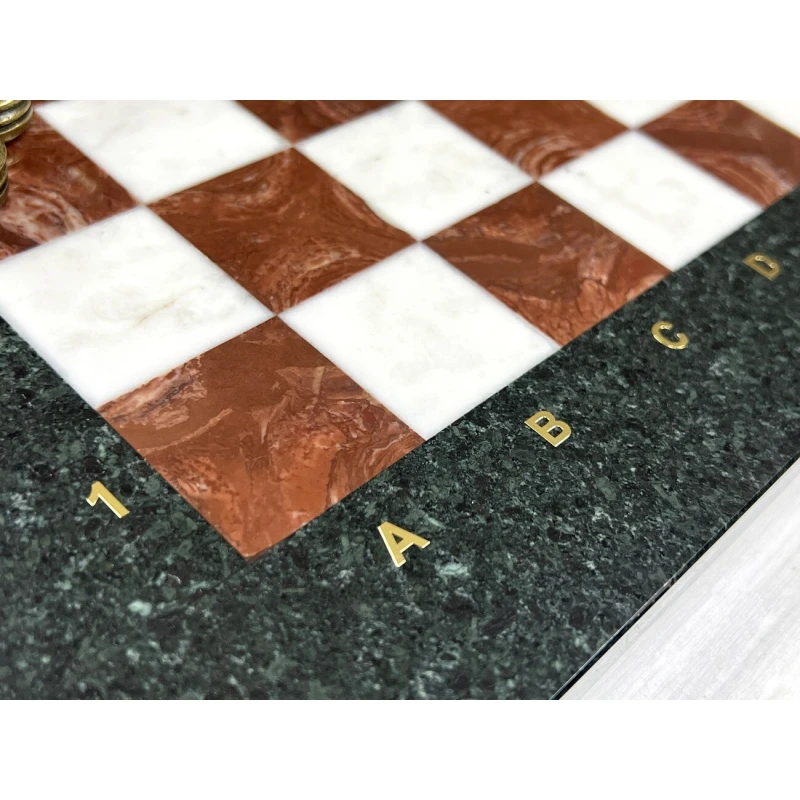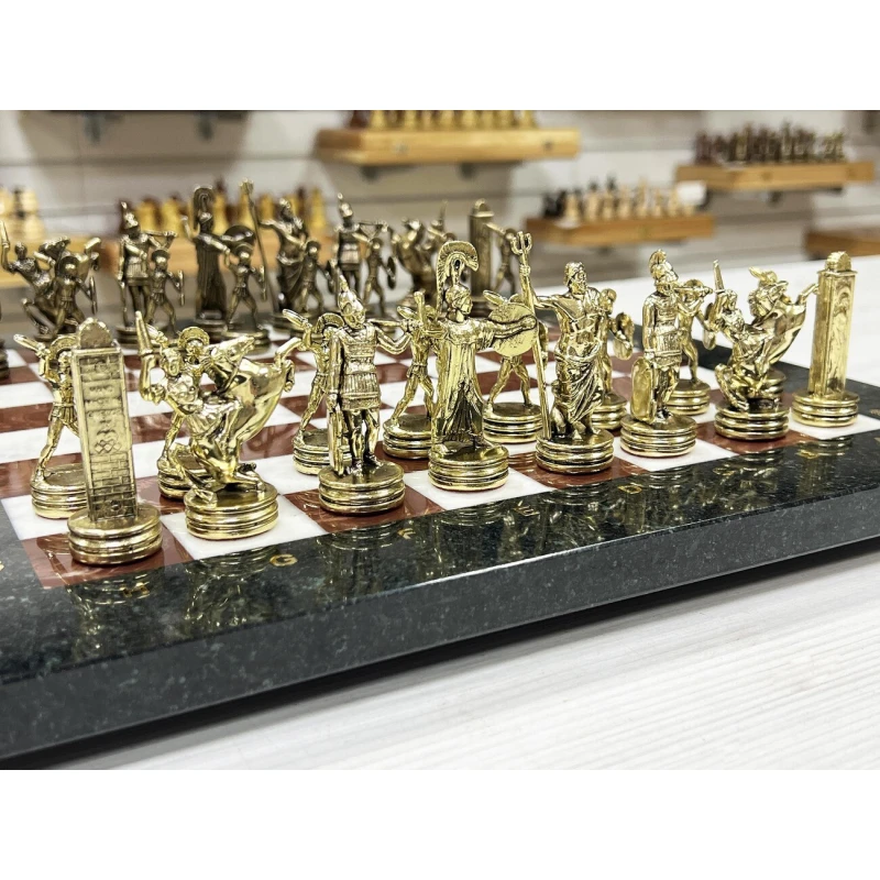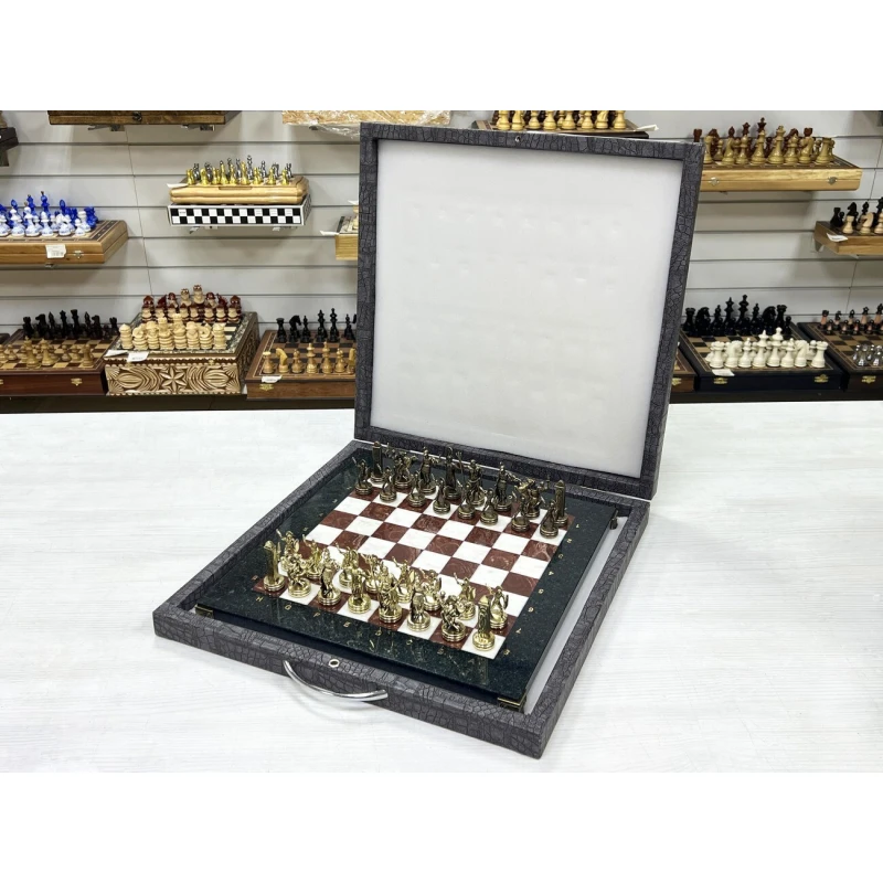 Шахматная доска из камня змеевика, мрамора и лемезита имеет классический дизайн, сделана вручную из натуральных и экологичных материалов. Фигуры в комплекте из металла в цвете золото и бронза в дизайне греческой мифологии. Шахматы поставляются в чемоданчике из экокожи. Идеальный вариант для роскошного подарка