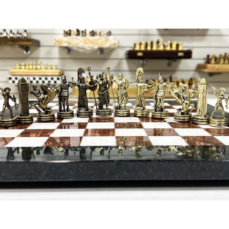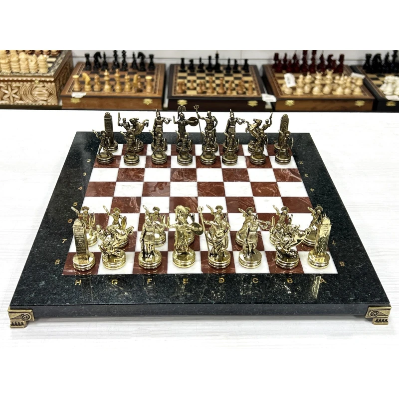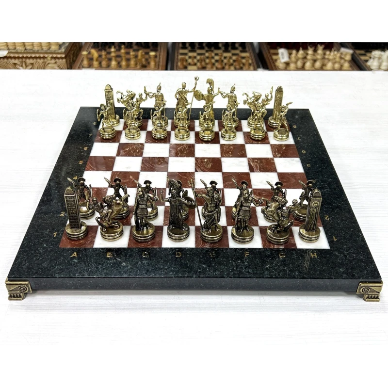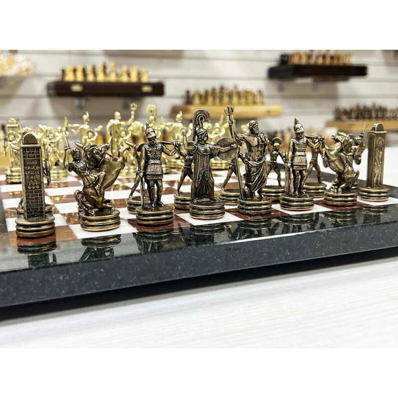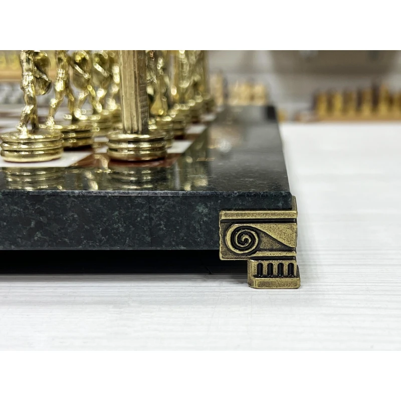 Шахматная доска из камня змеевика, мрамора и лемезита имеет классический дизайн, сделана вручную из натуральных и экологичных материалов. Фигуры в комплекте из металла в цвете золото и бронза в дизайне греческой мифологии. Шахматы поставляются в чемоданчике из экокожи. Идеальный вариант для роскошного подарка
