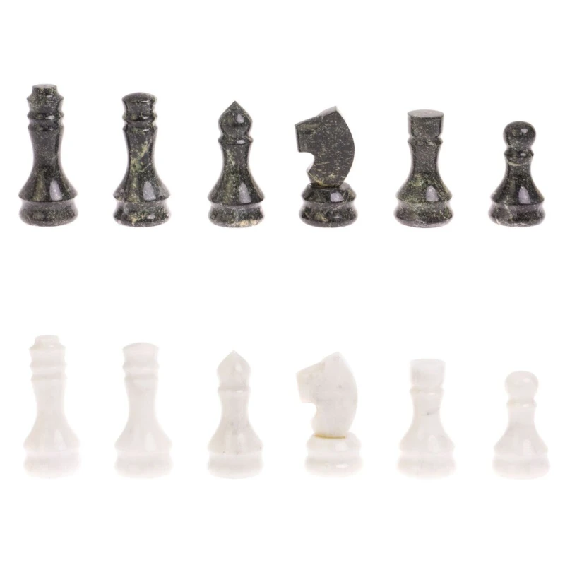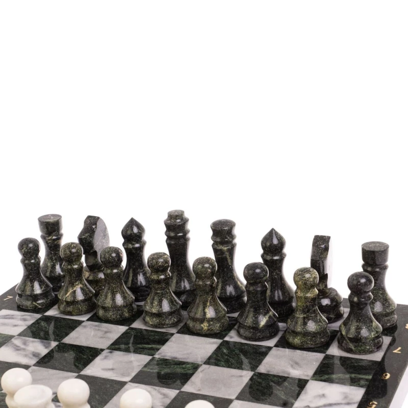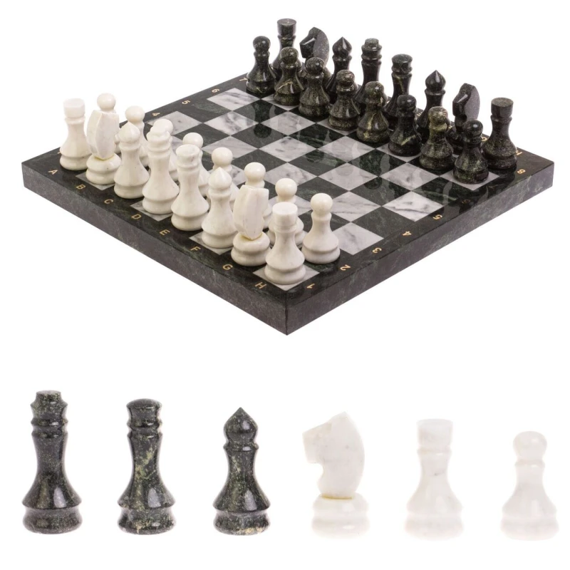 Классические каменные шахматы ручной работы. Размер доски 40 на 40 см. Высота короля 9 см, высота пешки 6.5 см. Материал темных фигур змеевик, материал светлых фигур мрамор. Упакованы в чемодан из экокожи. Вес набора -12 кг.