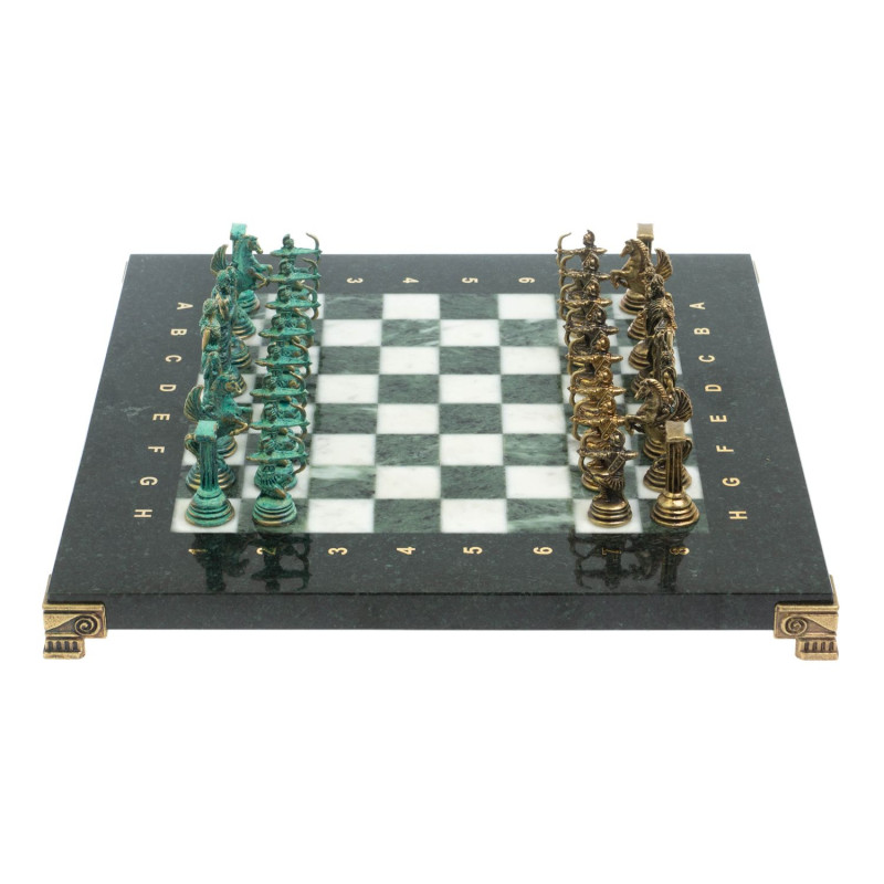 Шахматный набор "Лучники" изготовлен вручную, доска из природного камня, фигуры из металла в цвете бронза и патина. Характеристики: • доска 28х28х2,5 см • клетка 2,5х2,5 см • высота фигур: высота фигур: пешка 3,7 см, король 5,3 см • вес 6300 г.