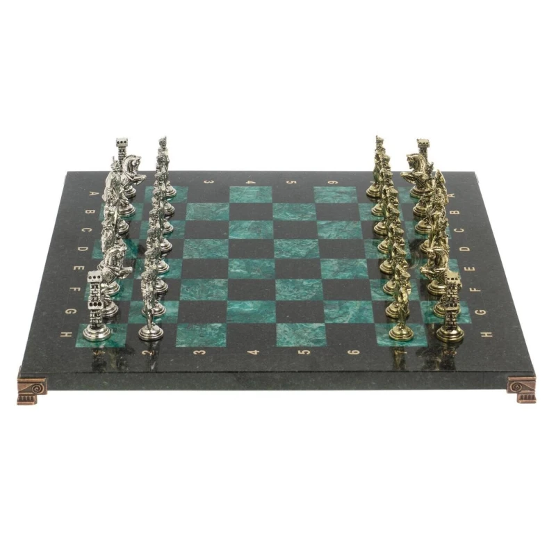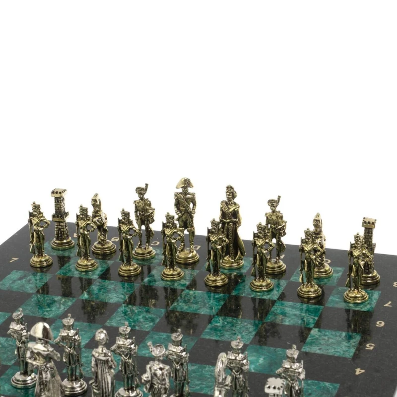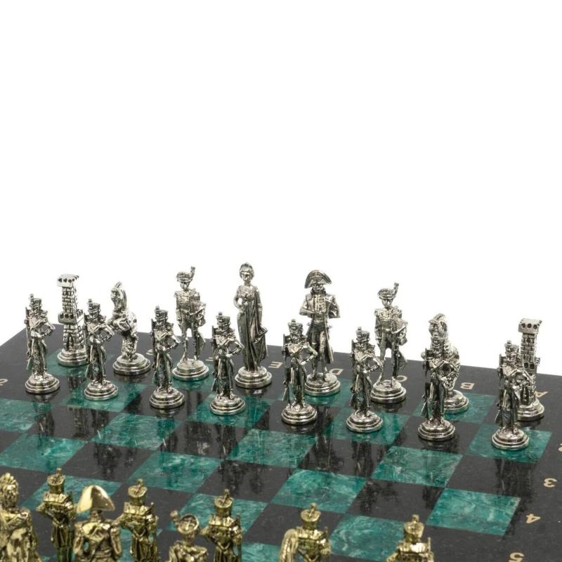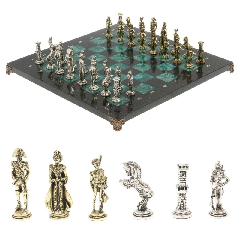 Шахматные фигуры в золотом цвете – русские войска во главе с Александром I, с другой стороны в серебряном цвете – французские войска во главе с Наполеоном Бонапартом. Фигуры выполнены из металла с высокой степенью детализации игровых персонажей. Доска изготовлена из уральских камней - черного и зеленого змеевика. В комплекте подарочный кейс из эко кожи.