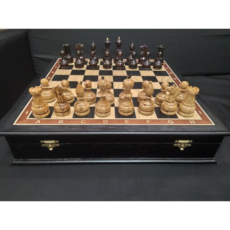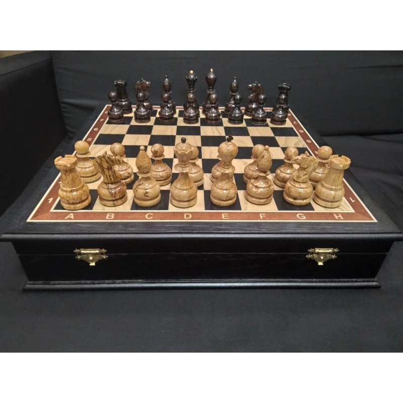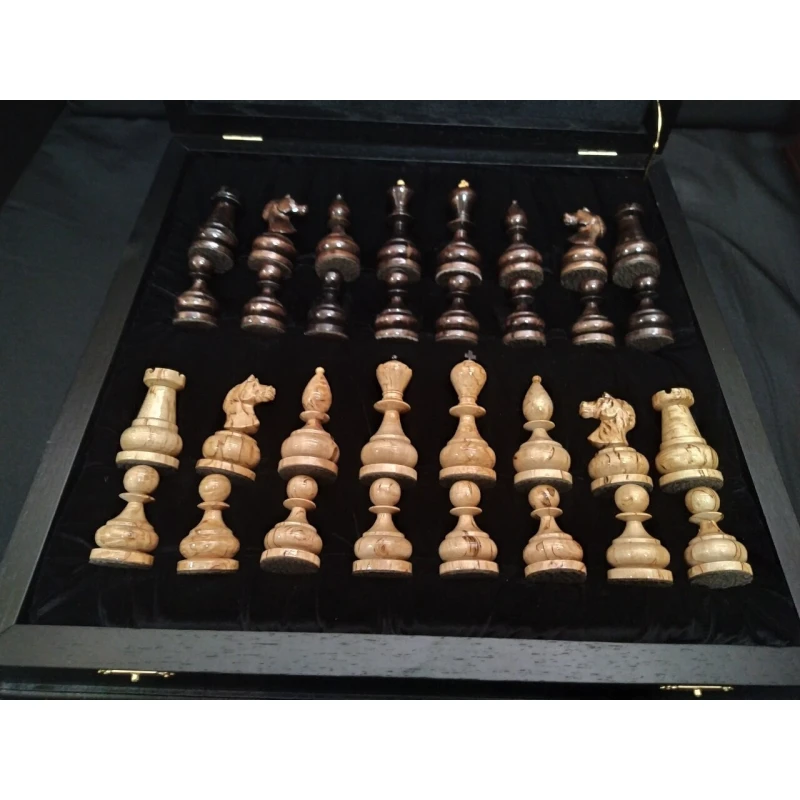 Эксклюзивные шахматы с фигурами из карельской березы. Производство Россия. Внутри каждая фигура хранится в своей ячейке. Материал доски моренный дуб, ясень.