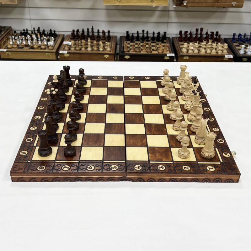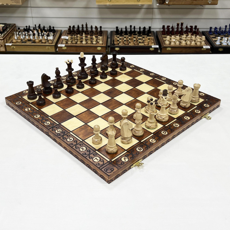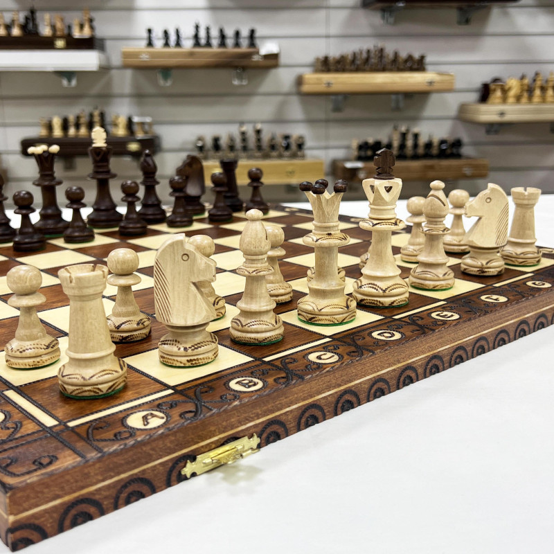 Размер игрового поля 48х48 см, доска органично впишется в интерьер вашего дома. Доска изготавливается из бука, прочного материала, который годами прослужит владельцу. По краям отрисована оригинальная разметка стильным и удобочитаемым шрифтом. Каждая отдельная ячейка поля вырезается вручную. С внутренней стороны доска обтянута специальным материалом. В ней вырезаны ячейки для каждой фигуры, чтобы они не ломались и не гремели при переноске.