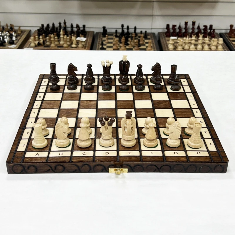 Королевские шахматы, название говорит само за себя, выполнены в царском стиле. Большие выпуклые фигуры, с высокоточной резьбой по дереву. Сверху покрыты лаком и обработаны специальным раствором, который увеличивает долговечность. Фигуры изготавливаются из груши. Это дерево сохраняет форму и даже после сотни игр фигуры будут выглядеть как новые.