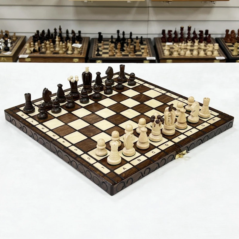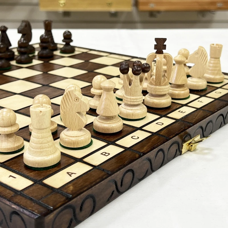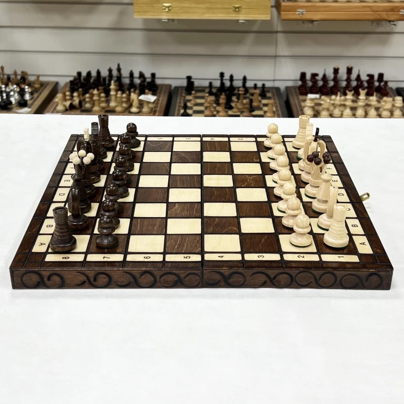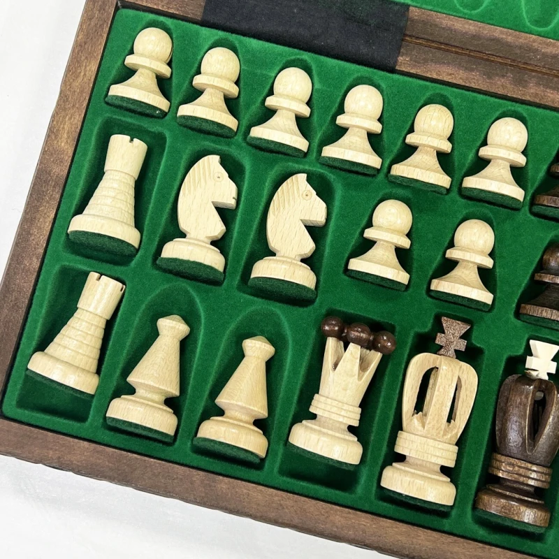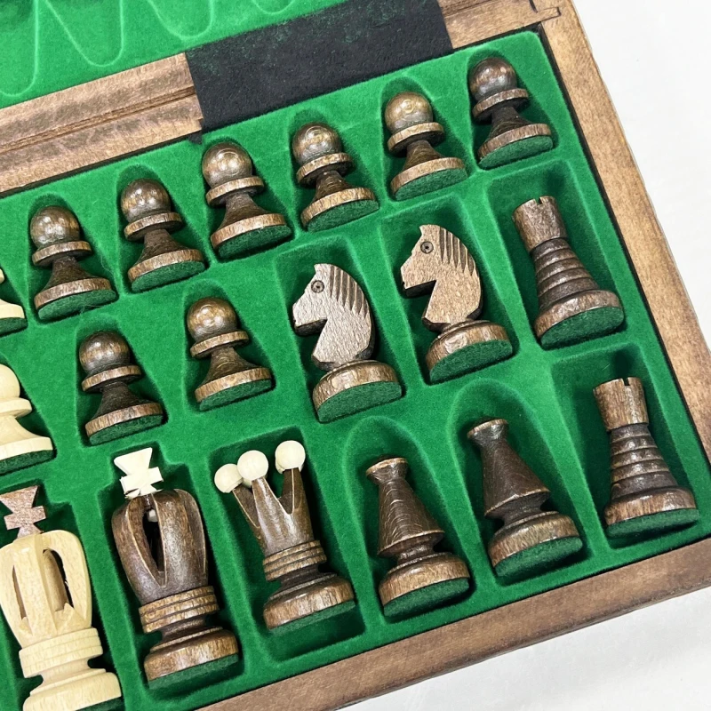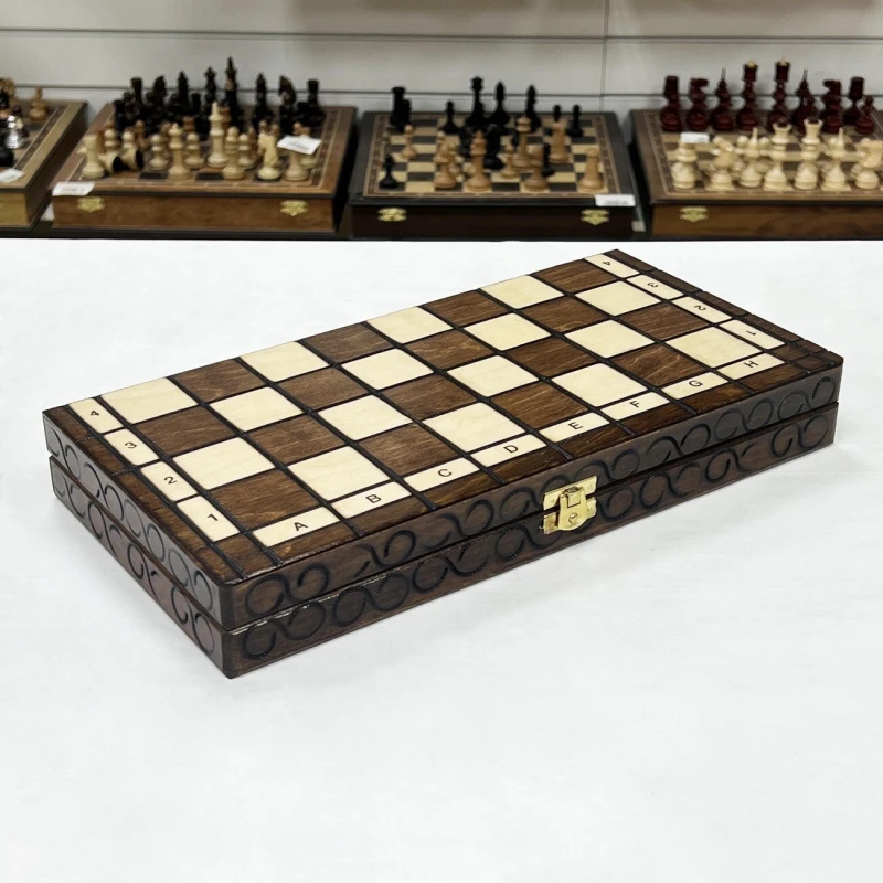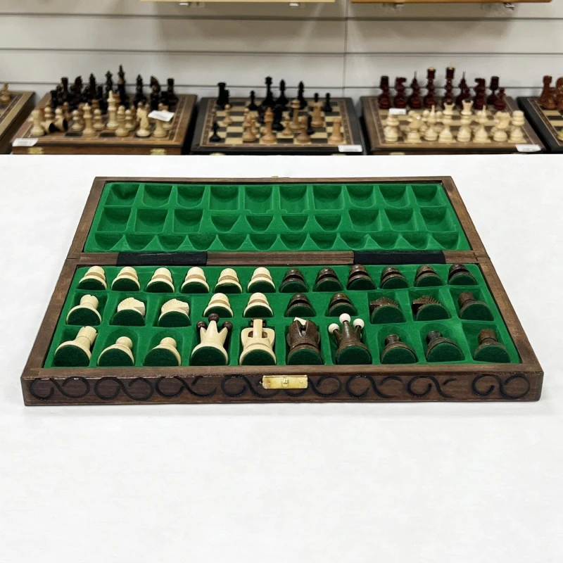 Доска изготавливается из липы, также прочной и долговечной породы дерева. Размер 35 на 35 см оптимален для комфортной игры как дома, так и вне его стен. Для удобной транспортировки и хранения с внутренней стороны доски имеются ложементы для каждой отдельной фигуры.