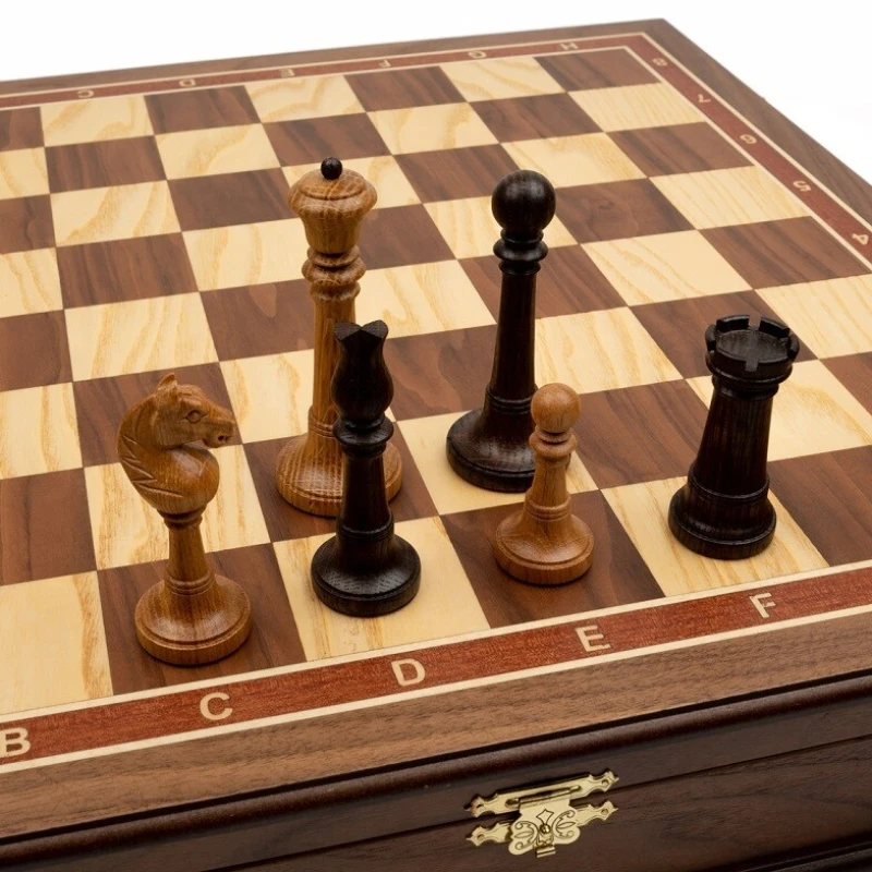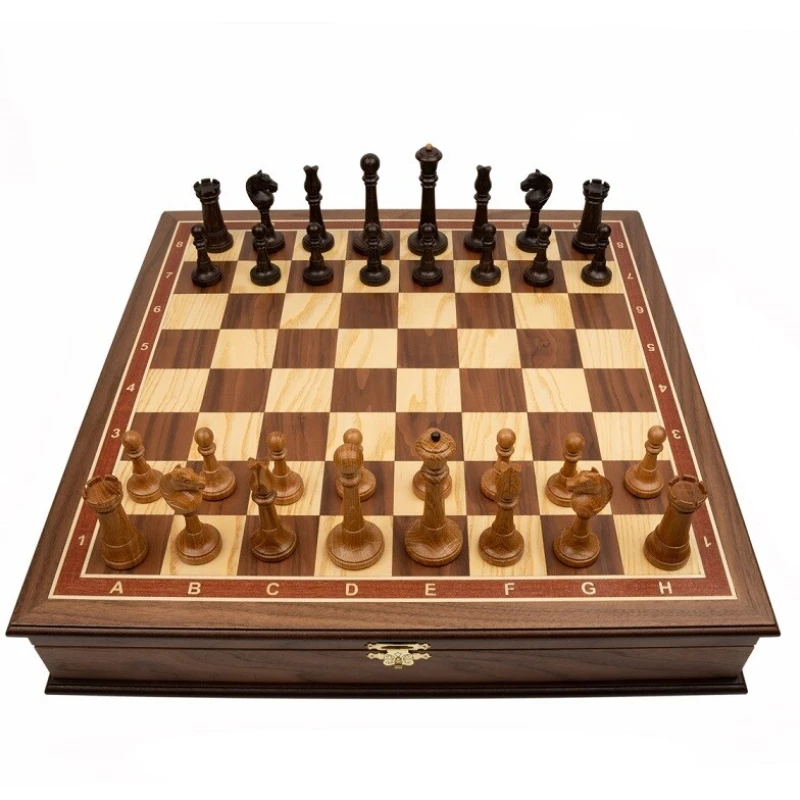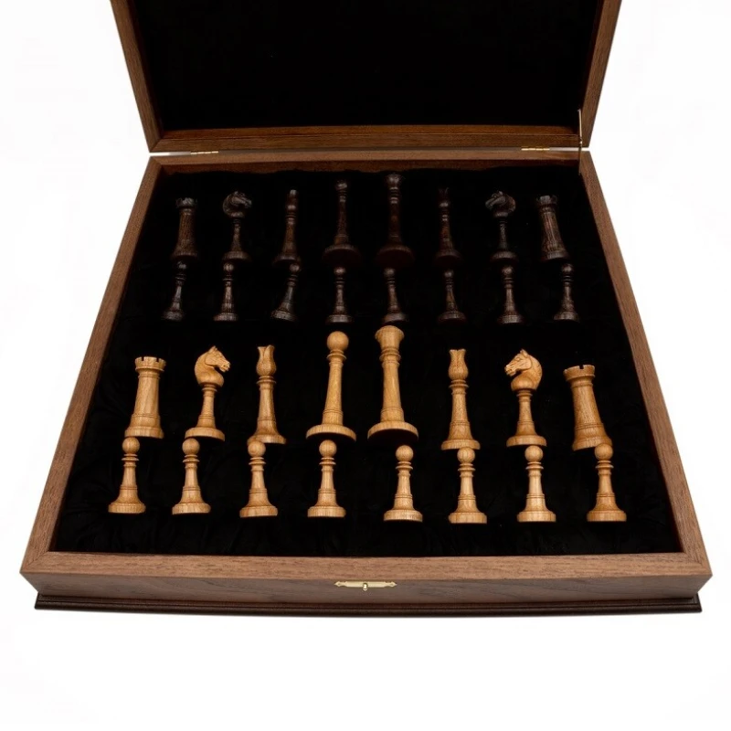 Оригинальный шахматный ларец с изящными фигурами из дуба. Материал доски орех, ясень, береза. Размер доски 50 см.