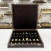 Доска реализована в виде ларца. Это довольно габаритное, но очень элегантное решение. Данный шахматный ларец будет отлично смотреться как предмет интерьера в кабинете руководителя, директора школы и других солидных людей. Крышка ларца имеет подъемный механизм, который открывает доступ к бархатным ячейкам для хранения шахматных фигур. Это делает удобным как хранение шахматных фигур, так и придает шахматам потрясающий дорогой внешний вид.