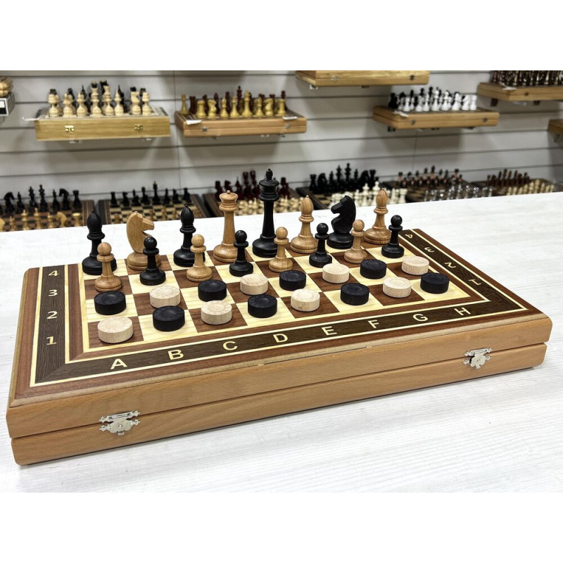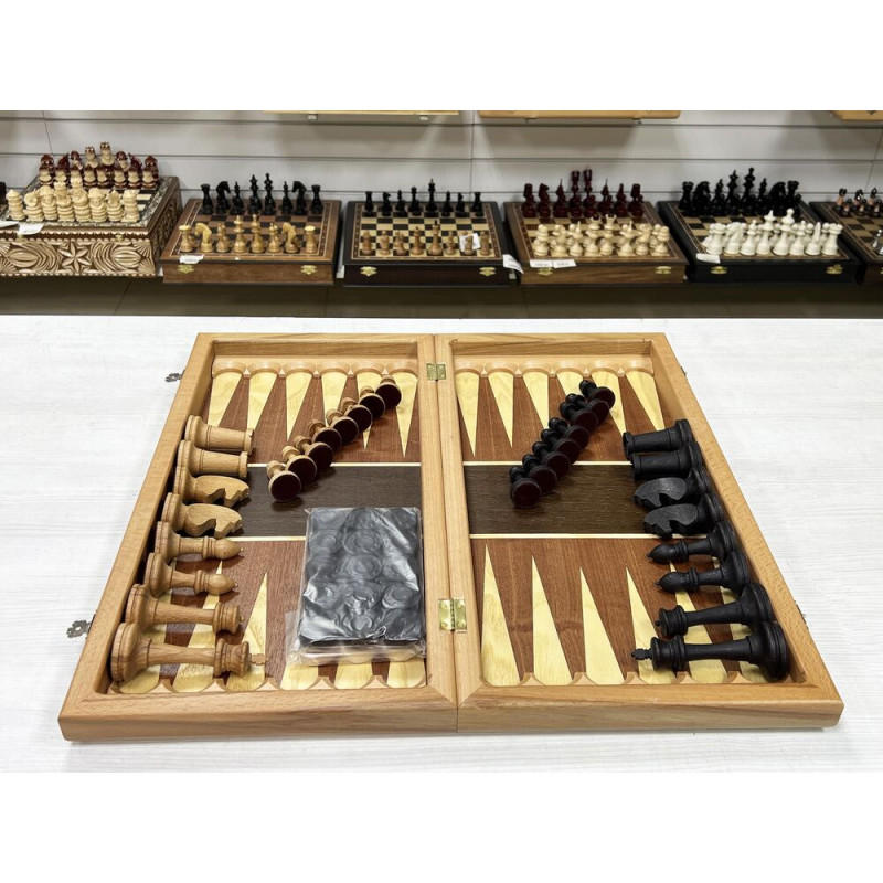 Размер клетки 5 на 5 см. Шахматная доска 50 на 50 см в разложенном виде. Внутри доски есть поле для игры в шашки. Шахматное поле и поле для игры в нарды собирается вручную в технике маркетри из красного дерева, ясеня и венге. Шахматные фигуры выполнены в классическом стиле Стаунтон. За счет широкого основания фигуры устойчивые на доске, несмотря на то, что утяжеления нет. Материал фигур бук. Подойдут в подарок для детей и взрослых. В наборе фишки для игры нарды тоже из бука и с подклейкой из ткани. Укомплектован набор игральными костями из пластика 2 шт. Купить подарочных набор шахмат с нардами можно в нашем магазине в Москве и в Санкт Петербурге, либо заказать доставку по всей России.