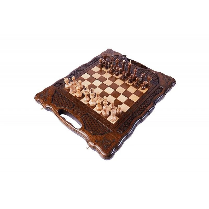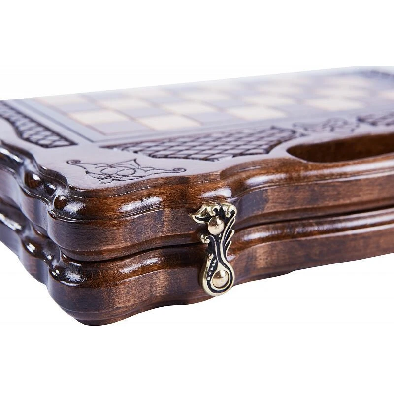 Автором этого удивительного комплекта 2-в-1 шахматы + нарды является известный армянский мастер. Доска, сделанная из буковой древесины, имеет интереснейший резной орнамент, поражающий своей детализацией. Каждый элемент дополняет предыдущий, сливаясь в единую композицию. Фигуры и фишки сделаны в классическом стиле. Каждая из них имеет подложку, которая нужна, чтобы защитить доску от механических повреждений. Кроме того, сама доска сверху покрыта декоративным лаком и скреплена надежной бронзовой фурнитурой.
