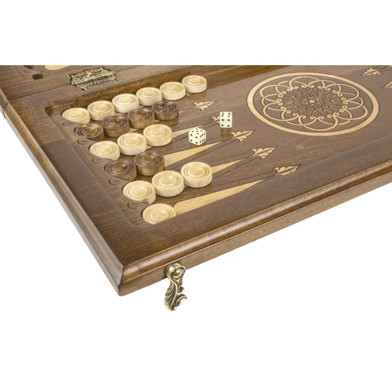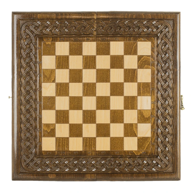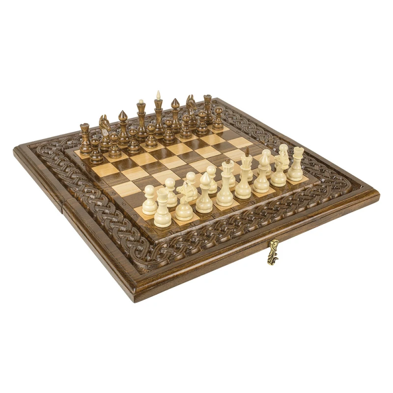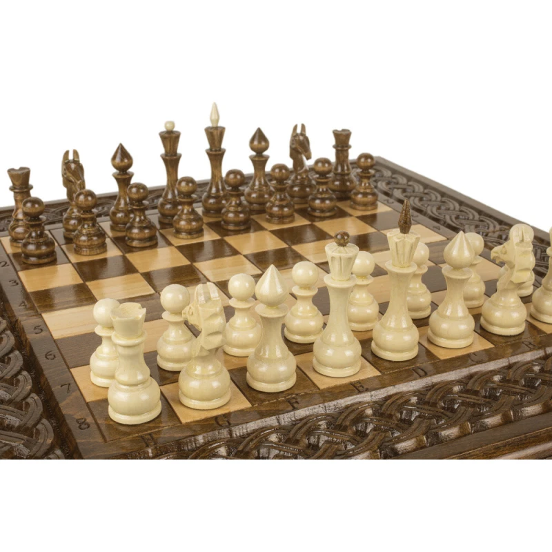 Шахматы + нарды резные "Армянский Орнамент 2" - это уникальный набор, который объединяет в себе три популярные настольные игры. Внешний вид украшен резным орнаментом, что придает игре особый шарм. Шахматы изготовлены из качественного дерева бука, что делает их прочными и долговечными. Размер шахмат всего 50 см, что делает их идеальным подарком для любителей настольных игр, а также очень удобным при перевозке или игре в дороге. Этот набор шахмат является не только увлекательной игрой, но и стильным элементом интерьера.