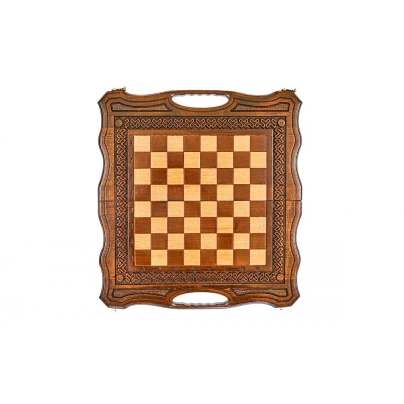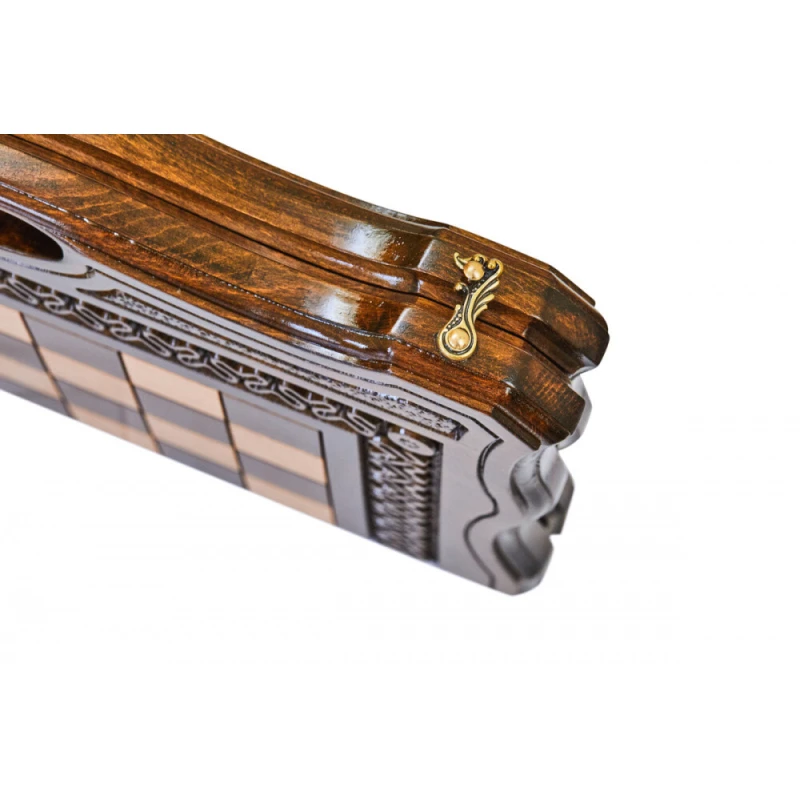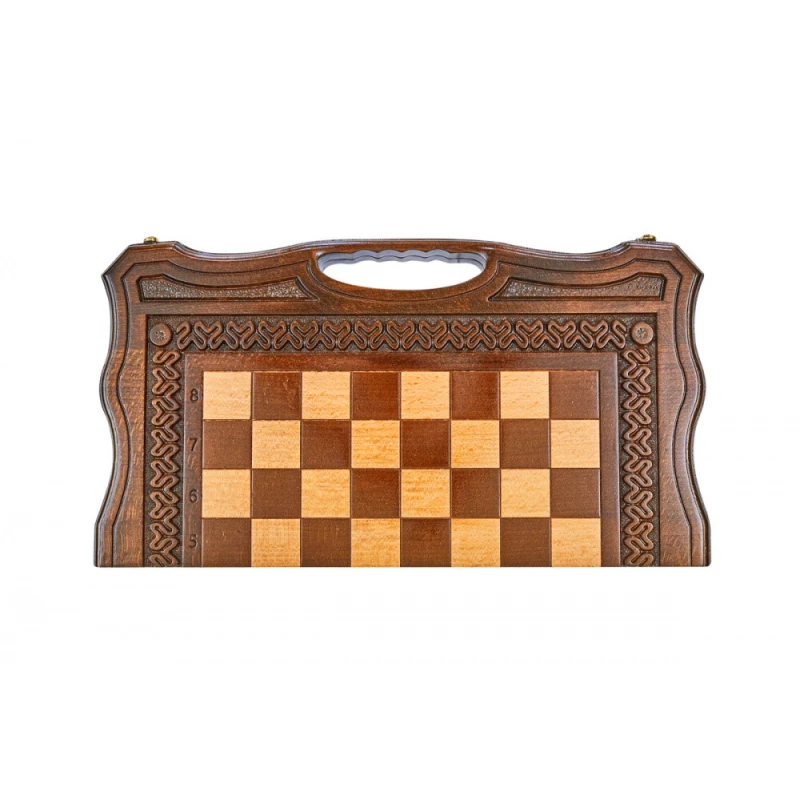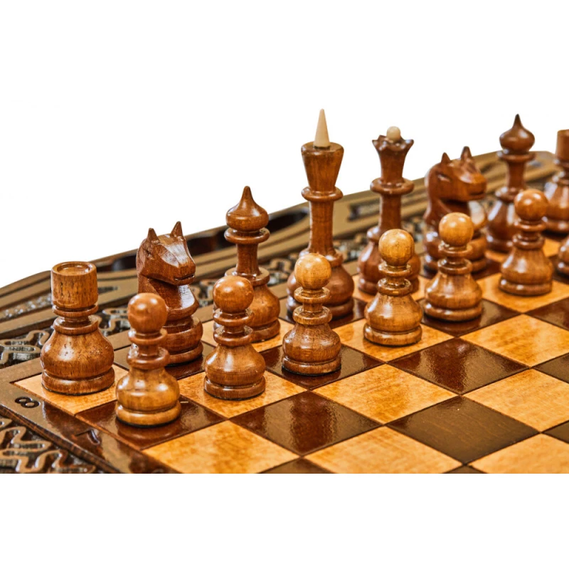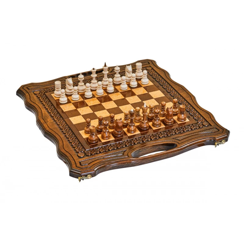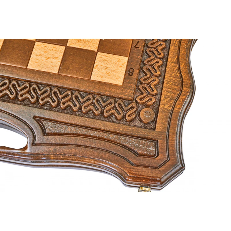 Что в коробке? 32 шахматные фигуры; 32 фишки; 2 шестигранных кубика; Доска; Чехол. Изящный подарочный набор 2-в-1 шахматы и нарды сделан из натуральной древесины высокого качества одним из самых известных в нашей стране мастеров. Это компактный комплект, который станет достойным украшением домашней коллекции и отличным вариантом подарка для близкого человека. Внешняя сторона доски украшена резной узорной рамкой, обрамляющей поле для шахмат. Нардовое поле также украшено резными узорами. Доска покрыта защитным лаком, а дополнительно от царапин ее защищают подложки на каждой фигуре и фишке.