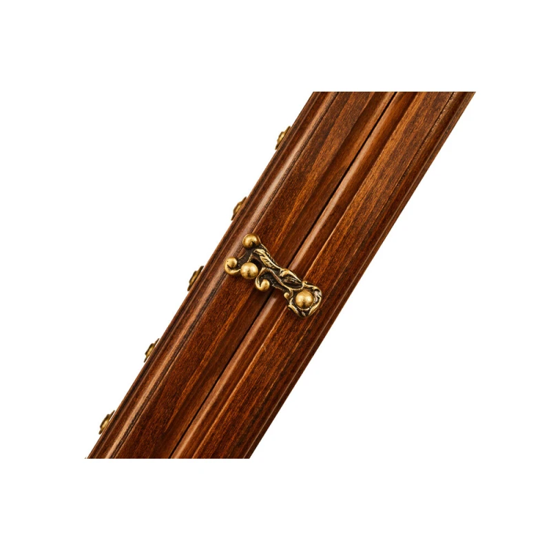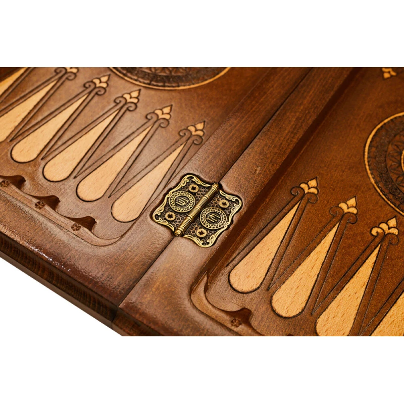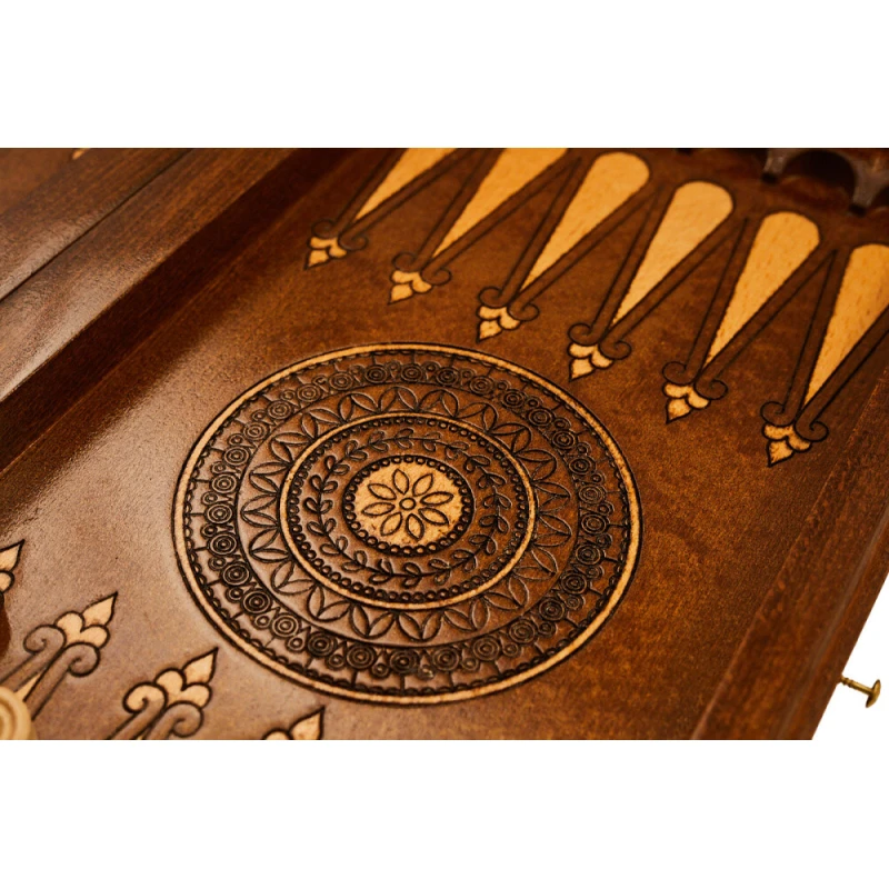 Снаружи нанесён геометрический узор, а древесная фактура намеренно оставлена, придавая доске уникальности и статусности. На внутренней части в центре нанесён красивый узор, а каждая лунка для фишек дополнительно подчёркнута каплевидным рисунком. Петли и крючки тоже вылиты в специальных формах, поэтому смотрятся эффектно и дорого.