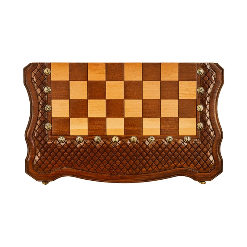 Главная особенность игровой доски для шахмат и нард заключается в оформлении. Автор потратил много времени за украшением, казалось бы, обычного куска дерева. Снаружи красивая резьба с 3D-элементами, внутри правильно вырезанные лунки для фишек. Есть разметка для обеих игр, а всё необходимое уже в комплекте. Купить себе или в подарок близкому человеку - эта игровая поверхность подойдёт для любых случаев.