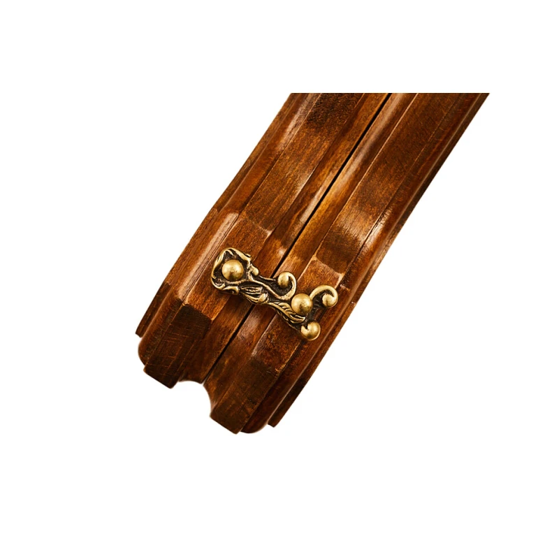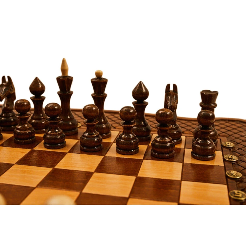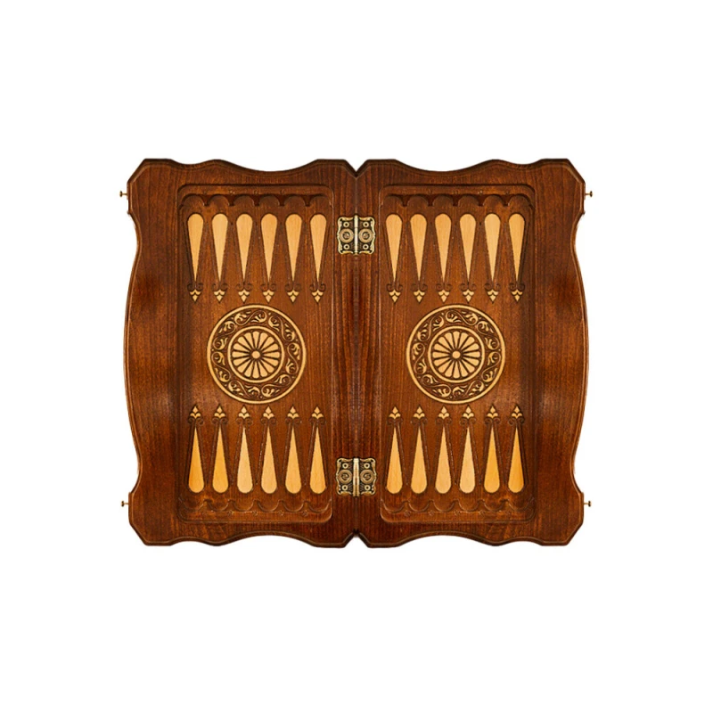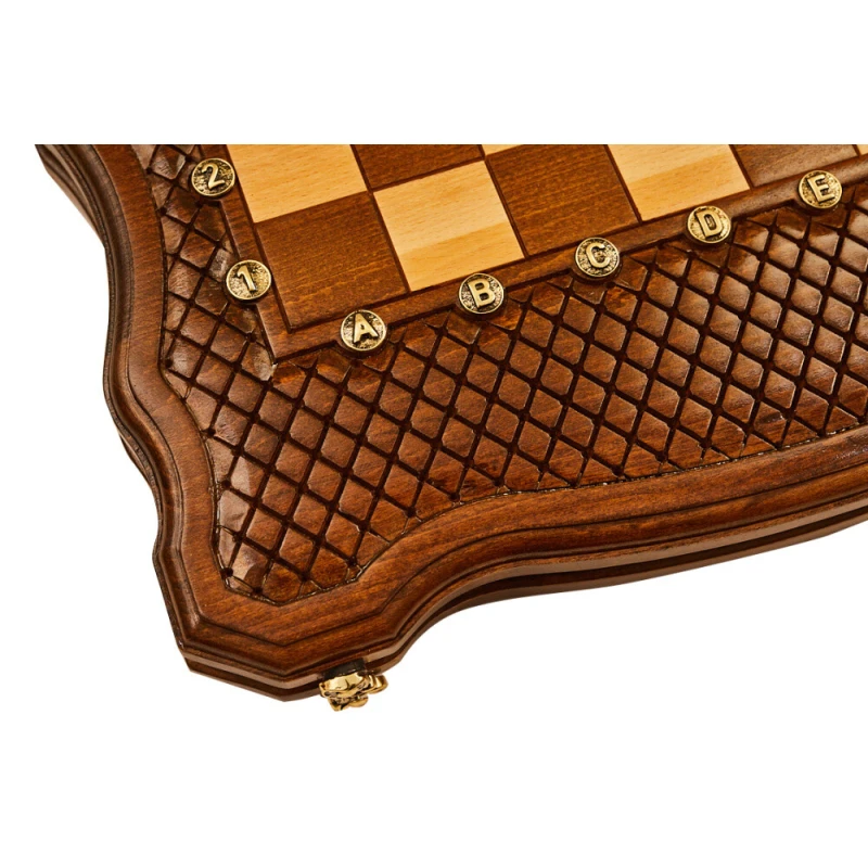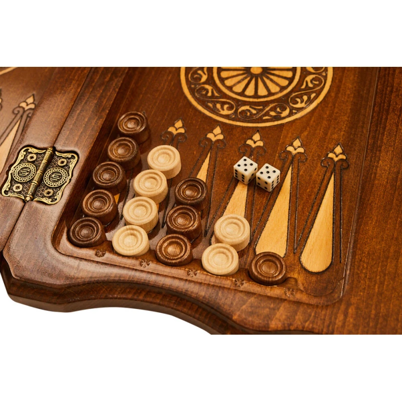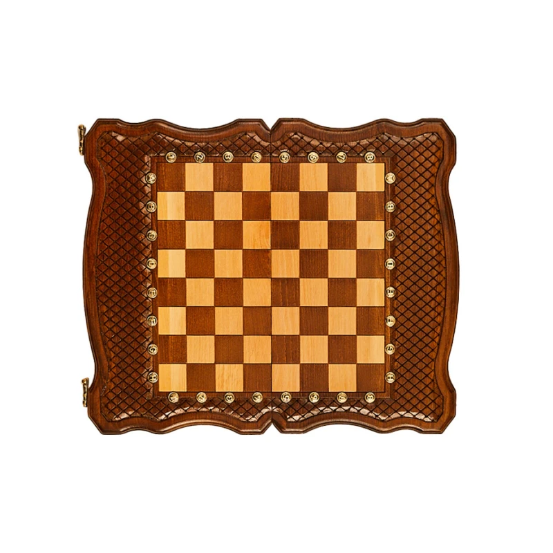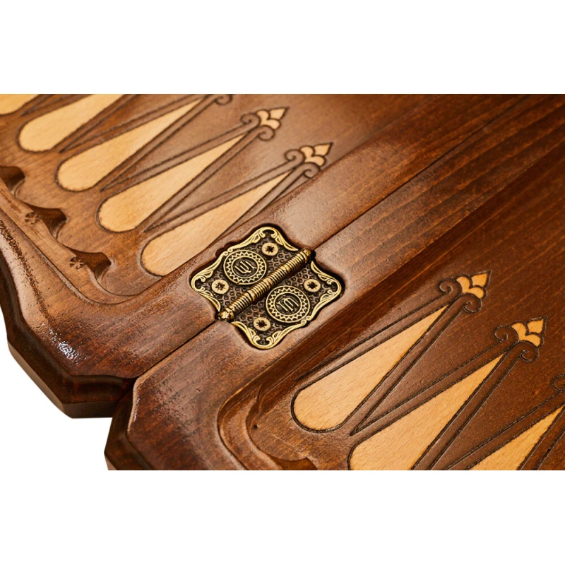 Эта доска выполнена из древесины бука, поэтому можно с уверенностью говорить о сроке службе в 5 лет и более. К тому же сама структура дерева добавляет уникальности каждому изделию, ведь узоры всегда получаются разными. Для скрепления створок между собой применяются металлические петли и крючки. Внутри есть достаточно места, чтобы хранить там комплектные фигурки, фишки, кости.