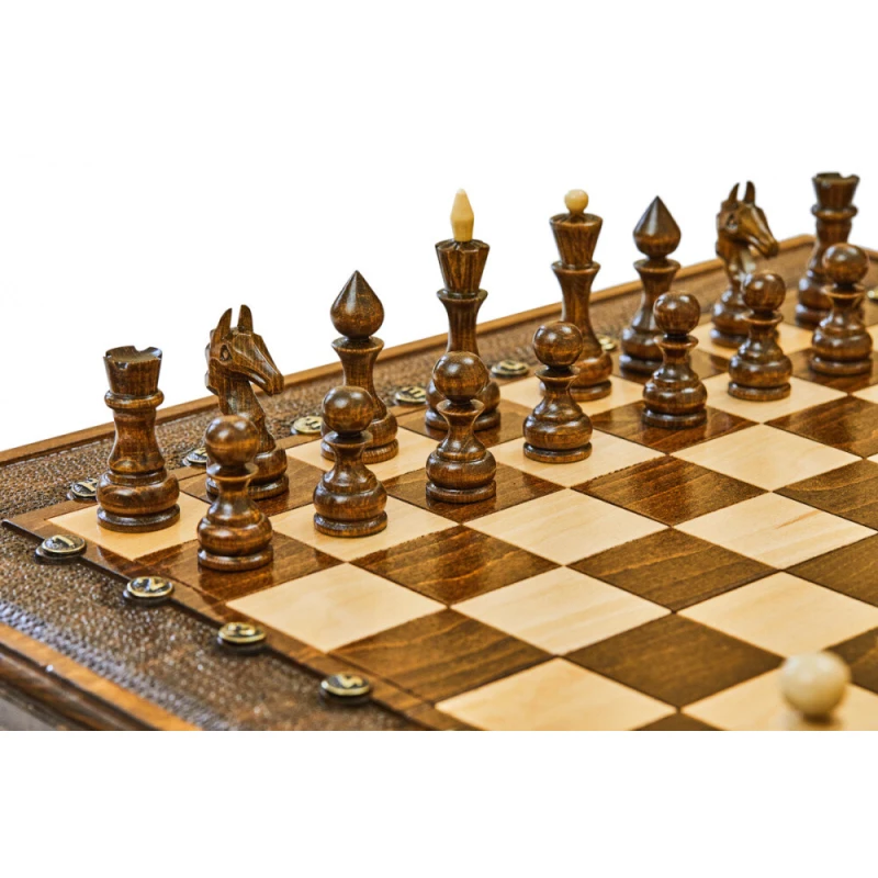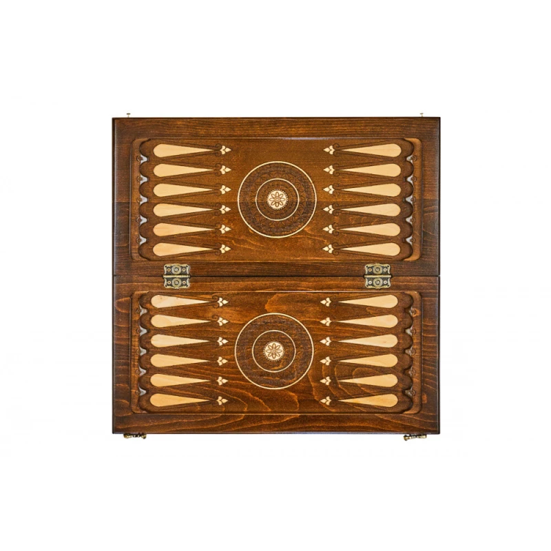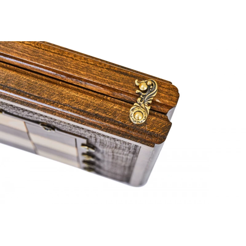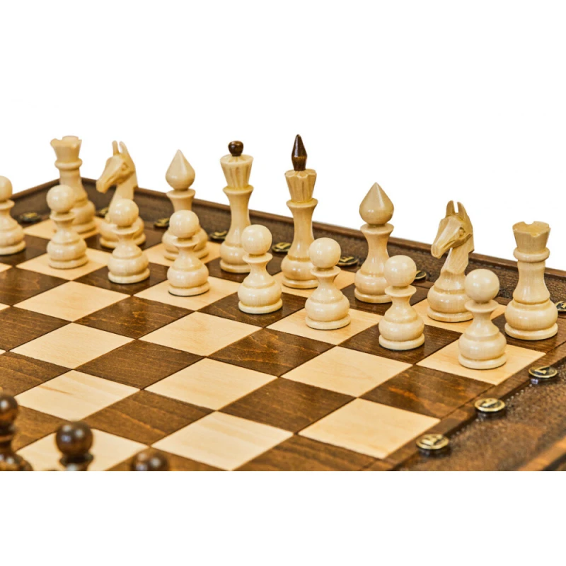 Что в коробке? 32 фишки; 32 шахматные фигуры; 2 шестигранных кубика; игральная доска; чехол. Подарочный набор классических настольных игр «Гамбит 1», сделанный из настоящей древесины бука – элегантное пополнение для вашей коллекции настолок. Такая коллекционная вещь может стать достойным подарком как для себя, так и для близкого человека, которого хочется порадовать. Презентабельный внешний вид набора подчеркивается его безупречным качеством. Доска украшена фактурной рамкой на внешней стороне и абстрактными узорами – на внутренней. Ее части скреплены между собой медной фурнитурой. Каждый элемент комплекта покрыт глянцевым лаком, а фигуры и фишки также дополнены мягкими подложками, предотвращающими царапание поверхности.