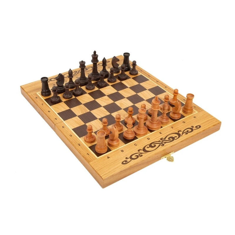Классические набор шахмат с нардами. Внутри шахматной доски есть ячейки для хранения фишек для нард. В комплекте шахматные фигуры, фишки для шашек и нард, игральные кости. Материал доски дуб.