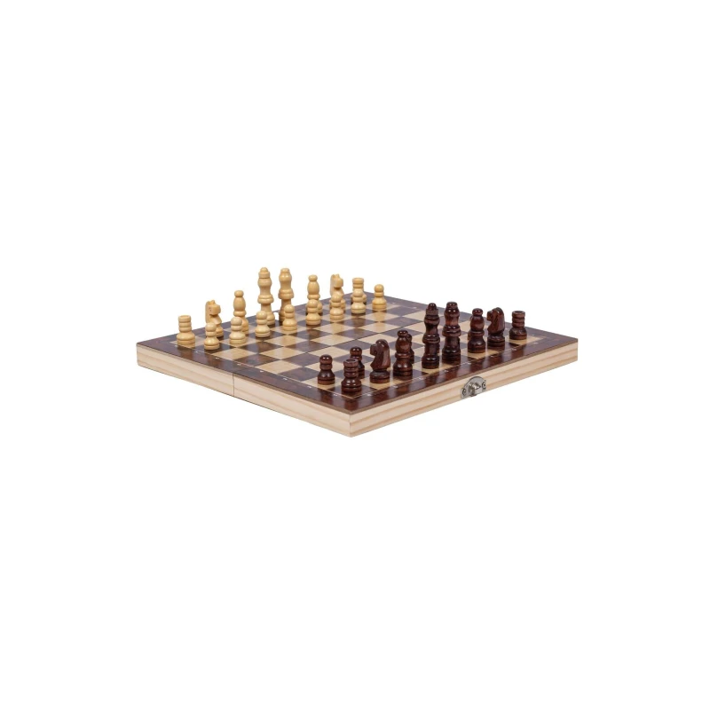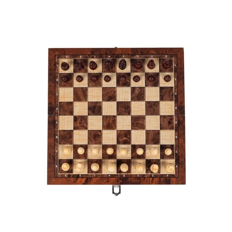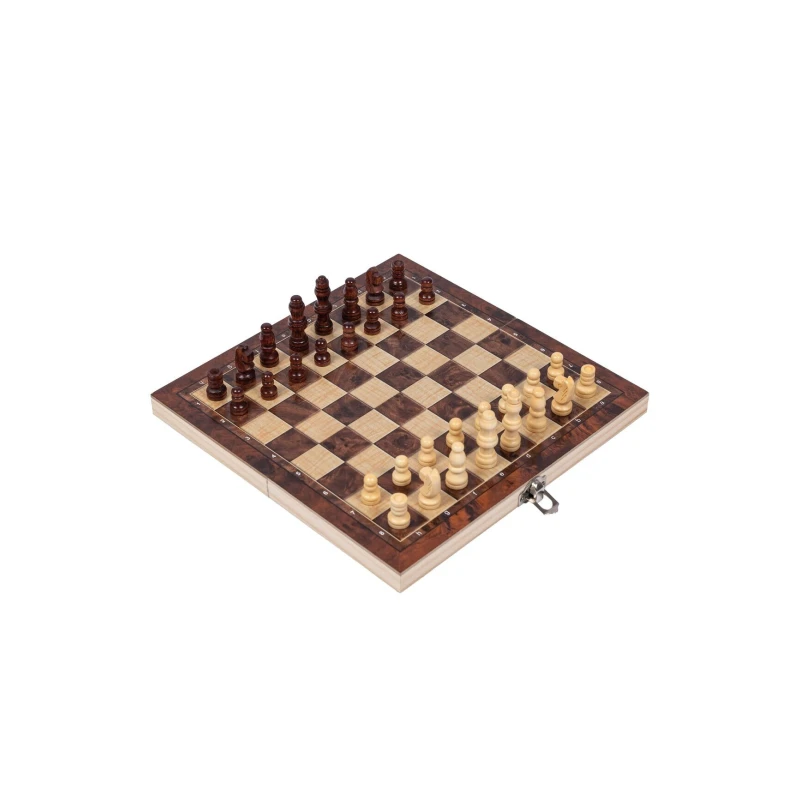 Маленькие шахматы из дерева, в наборе игральные кости, фишки для нард (они же шашки), шахматные фигуры. Внутри доски есть поле для нард. Размер доски в разложенном виде 24 на 24 см.