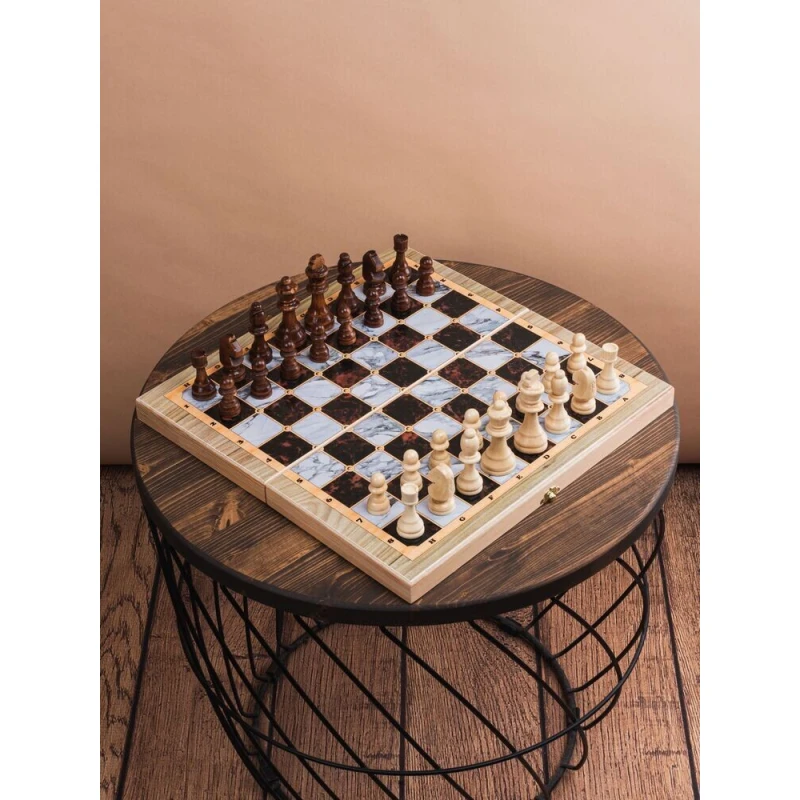 Подарочный набор игр 3 в 1. Шахматы, нарды, шашки. Доска складная, 40 на 40 см в разложенном виде.Закрывается на замок. В комплекте игральные кости, фишки и шахматные фигуры. Высота короля 9 см.Шахматная доска с полем для нард внутри, фишки для нард, шахматные фигуры, кости игральные.