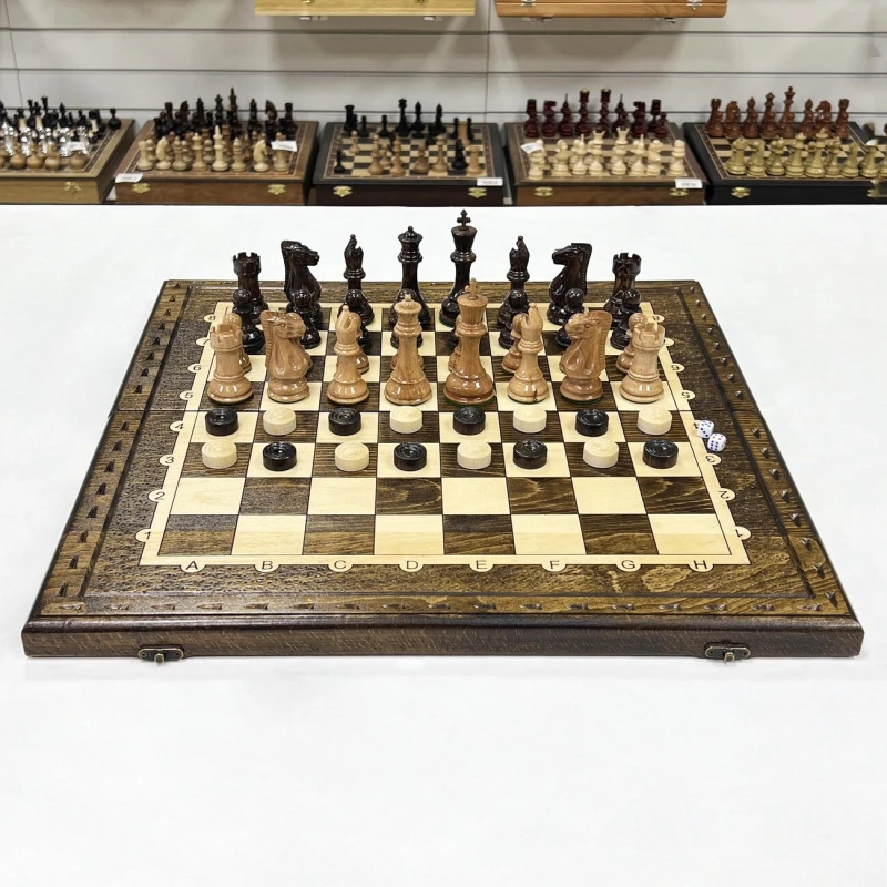 Резные шахматы 3 в 1 ручной работы из массива бука с утяжеленными фигурами в классическом стиле Стаунтон из дуба и клена. Размер доски в разложенном виде 50 на 50 см. Внутри поле для игры в нарды. В комплекте игральные кости , фишки для нард (они же шашки) шахматные фигуры. Шахматные фигуры покрыты глянцевым лаком. Высота короля 10 см, высота пешки 5 см. Хороший подарочный набор для взрослых и детей.