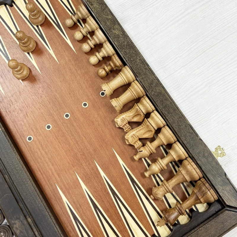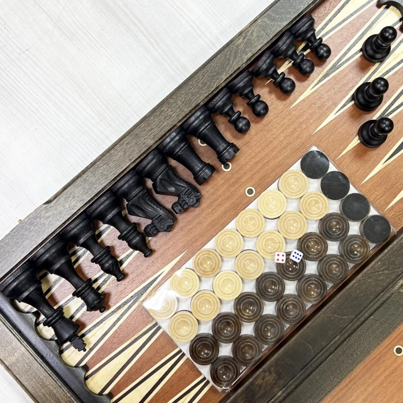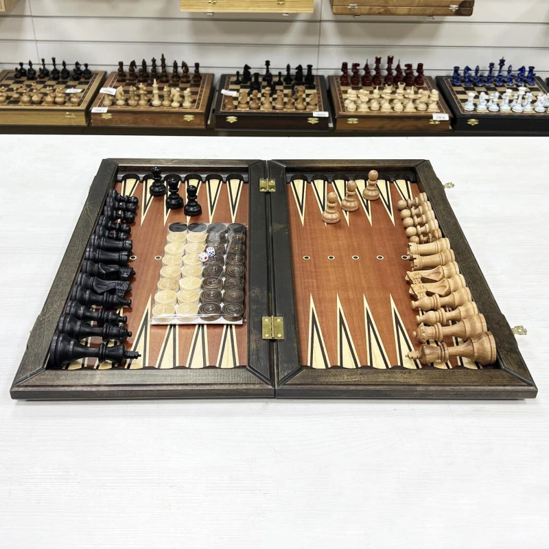 Игровой набор 3 в 1: Нарды, шашки, шахматы с фигурами Стаунтон! Эта уникальная деревянная доска из массива липы размером 55 на 55 см в разложенном виде станет не только полем для интеллектуальных сражений, но и памятным сувениром. На поверхности доски- рисунок в технике маркетри ручной работы, изображающий красивый орнамент. Внутри доски поле для игры в нарды. В комплекте идут деревянные шахматные фигуры ручной работы из Индии - Стаунтон (король высотой 10 см, пешка – 5 см). Фигуры выполнены из палисандра и самшита, отполированы воском, деревянные фишки, которые можно использовать как для игры в нарды, так и для шашек. Этот набор станет отличным подарком для любителей настольных игр.