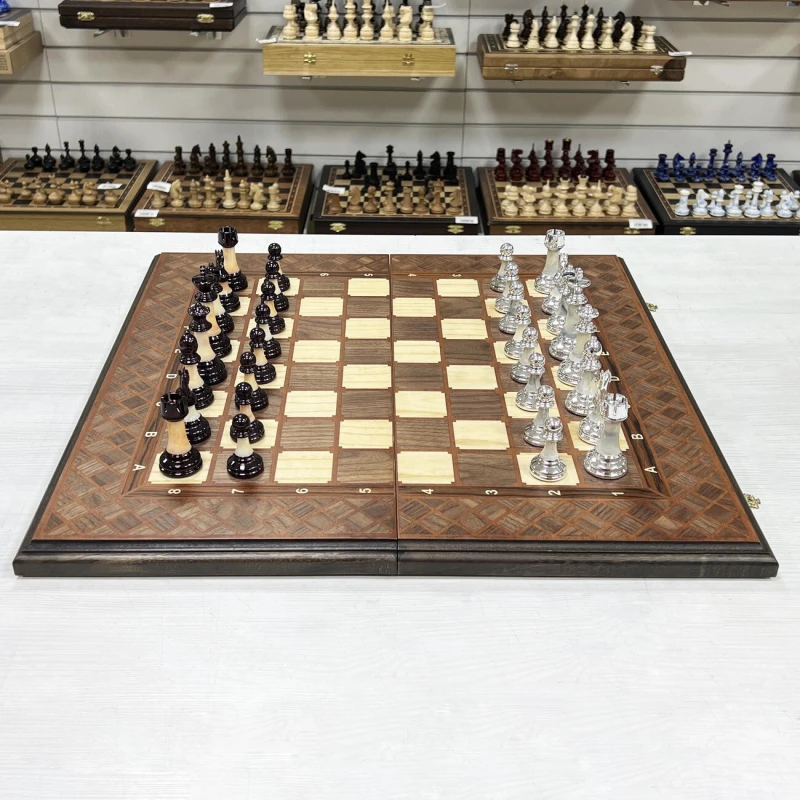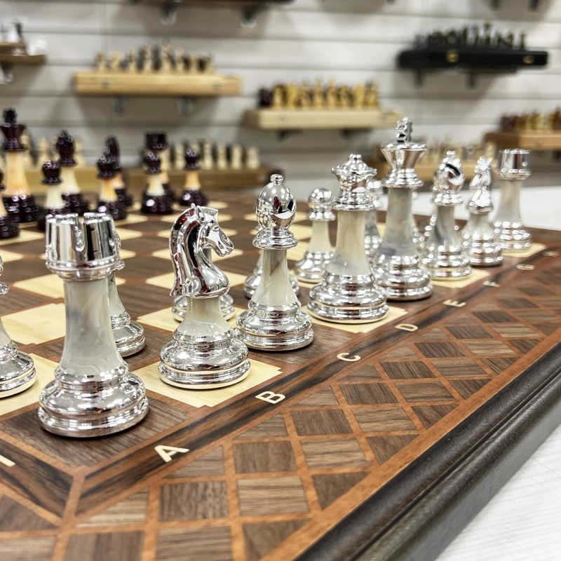 Подарочные шахматы ручной работы с необычными фигурами в стиле Итальянский дизайн из композитных материалов. Шахматные фигуры сделаны с утяжелением для повышеной устойчивости. Размер доски 56 на 56 см в разложенном виде , внутри доски есть поле для игры в нарды. Ручная работа. Поле собирается в технике маркетри. Купить набор игр шахматы, нарды, шашки можно в наших магазинах в Москве и Санкт Петербурге, либо можно заказать доставку по всей России. Выбрать шахматы деревянные, подарочные шахматы, шахматы ручной работы, шахматы для детей и взрослых, шахматы эксклюзивные можно с помощью наших специалистов по телефону +7 (495) 662-99-14