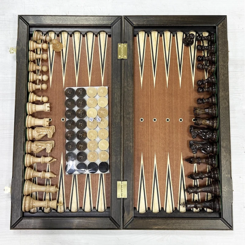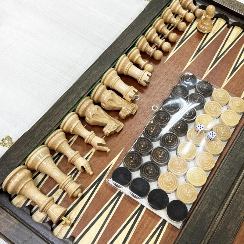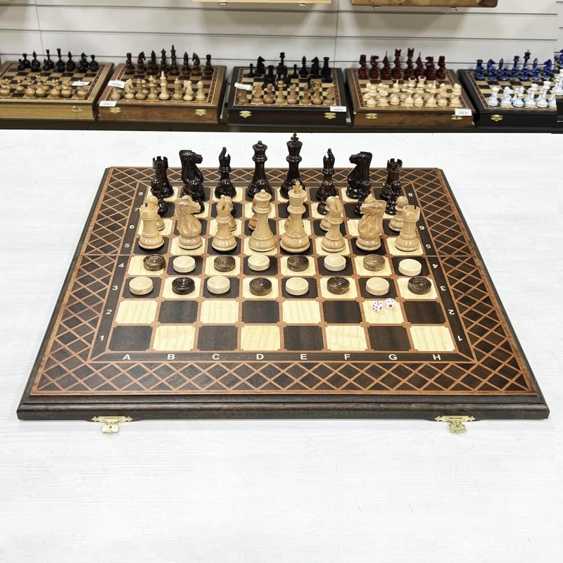 Подарочный набор игр шахматы и нарды в одной доске. Размер доски в разложенном виде 56 на 56 см. Шахматное поле и поле для нард собирается вручную в технике маркетри из ценных пород дерева. Ручная работа. Шахматные фигуры выполнены в классическом стиле Стаунтон и сделаны из дуба и клена, покрыты глянцевым лаком. В основании фигур есть металлический сердечник для утяжеления. Высота короля 10 см, высота пешки 5 см. Внутри доски поле для игры в нарды. Размер фишки 30 мм. В комплекте игральные кости. Подойдут в подарок для детей и взрослых. Сделаны в России.