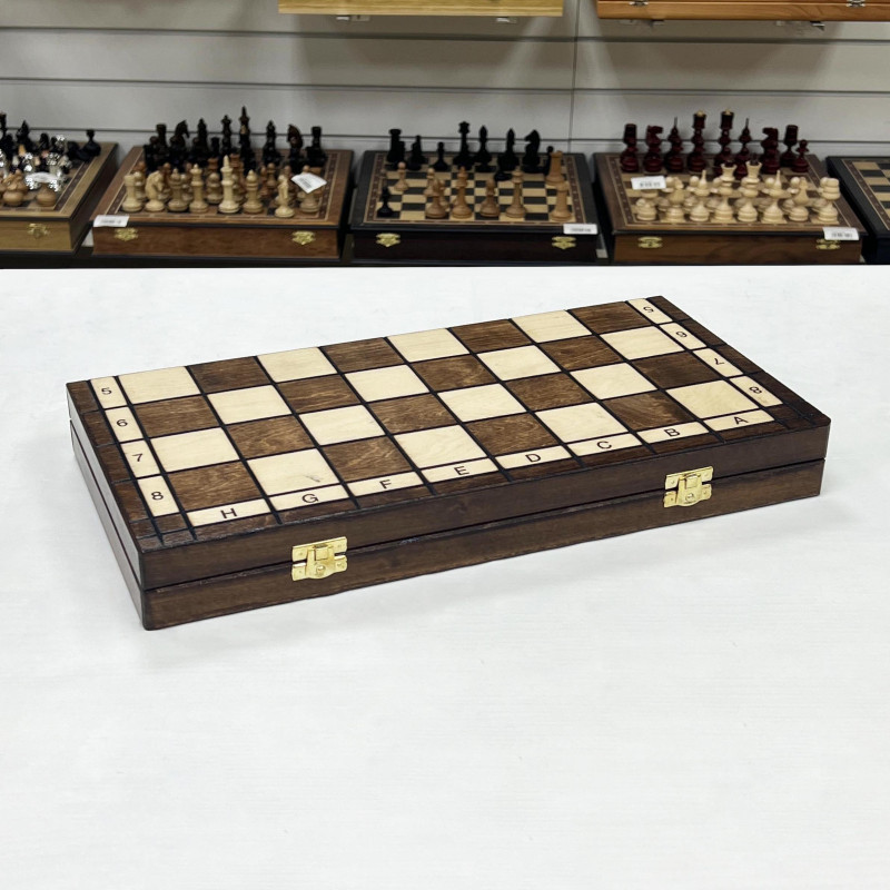 Доска также делает из хорошо обработанной липы. С внутренней стороны доска обтянута специальным материалом и для каждой фигуры имеются ячейки, значительно снижающие износ фигур и грохот при их транспортировке. Это очень кстати, так как размер доски 42х42 см, и она подходит как для игры дома, так и за его пределами. Для защиты доски царапин и сколов, основание фигур обтягивается мягкой тканью.