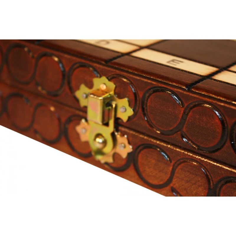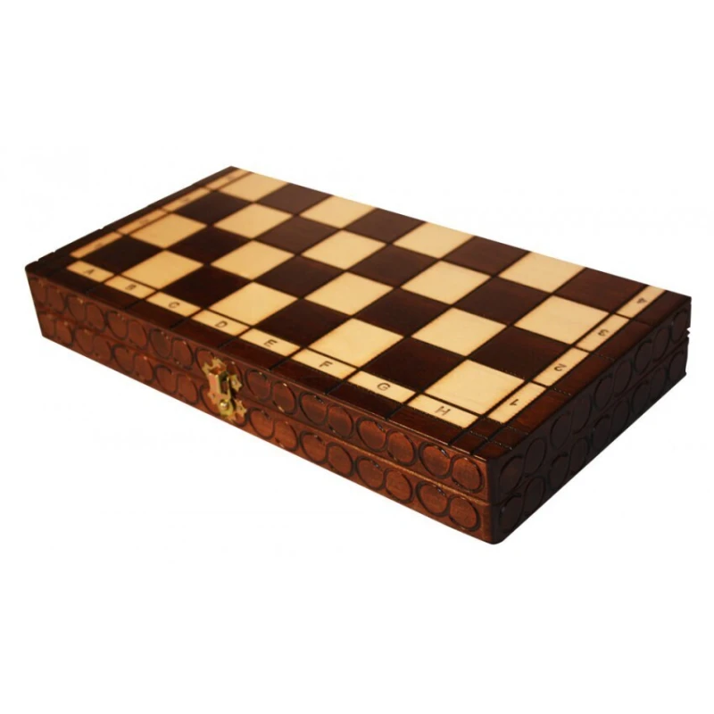 Доска также делает из хорошо обработанной липы. С внутренней стороны доска обтянута специальным материалом и для каждой фигуры имеются ячейки, значительно снижающие износ фигур и грохот при их транспортировке. Это очень кстати, так как размер доски 36х36 см, и она подходит как для игры дома, так и за его пределами. Для защиты доски царапин и сколов, основание фигур обтягивается мягкой тканью.