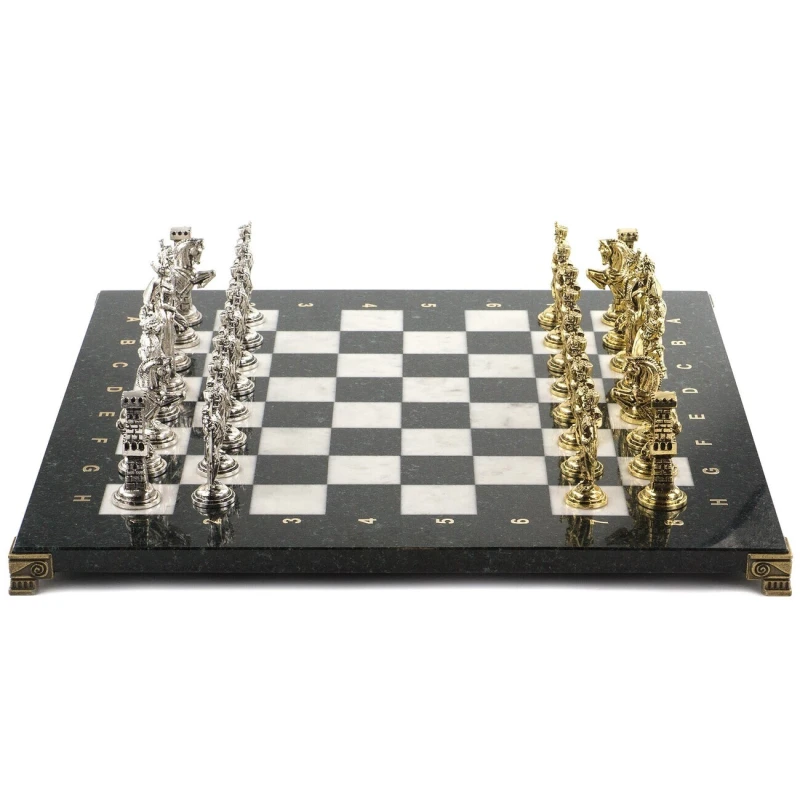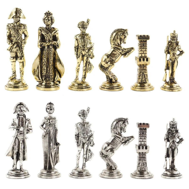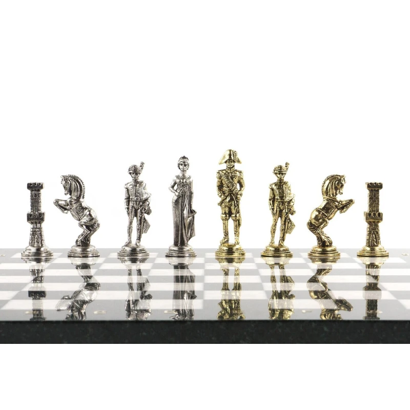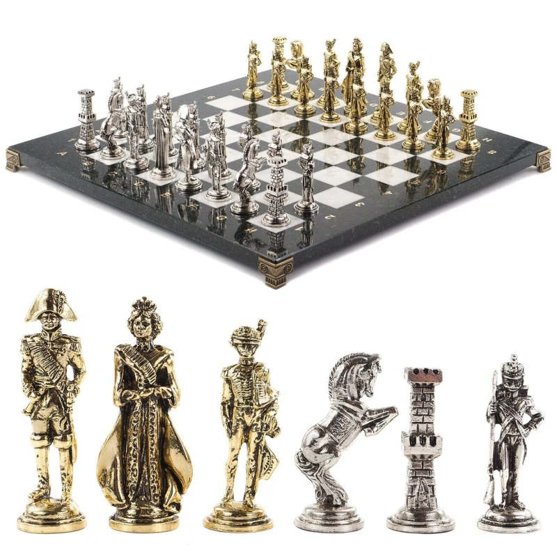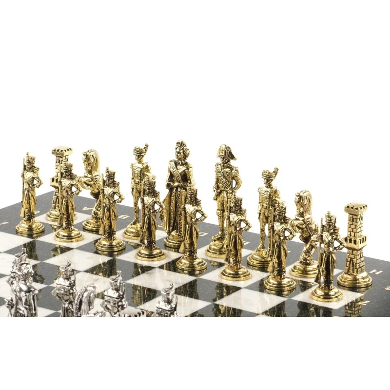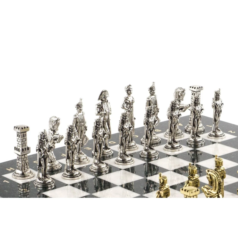 Исторические шахматы – новинка в нашем ассортименте. Шахматные фигуры в золотом цвете – русские войска во главе с Александром I, с другой стороны в серебряном цвете – французские войска во главе с Наполеоном Бонапартом. Фигуры выполнены из металла с высокой степенью детализации игровых персонажей. Доска изготовлена из уральских камней: черного змеевика и белого мрамора. В комплекте оригинальный кейс из экокожи.