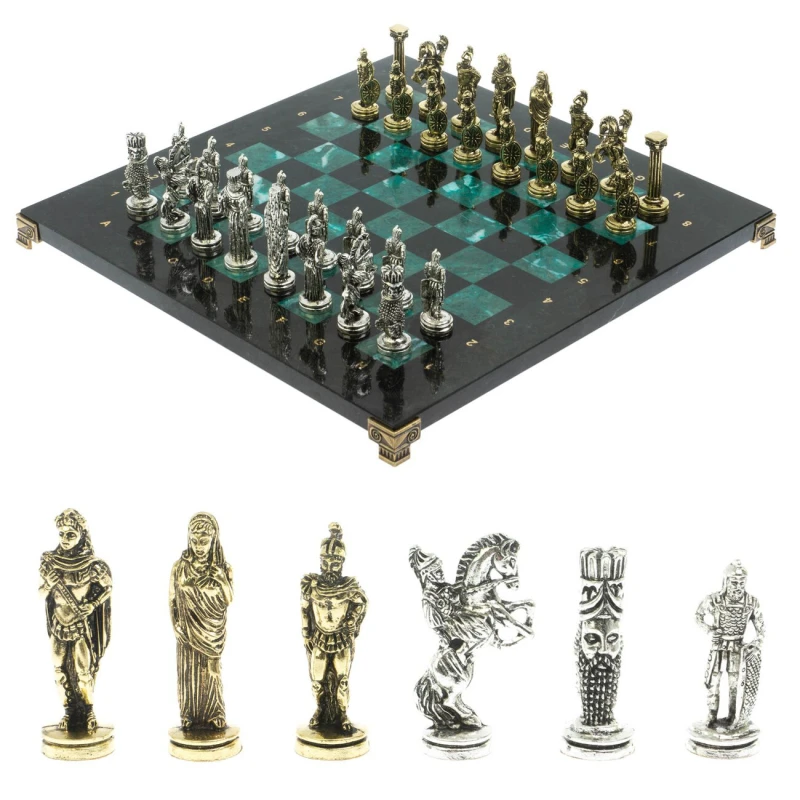 Подарочные каменные шахматы -Александр Македонский. Размер доски 36 на 36 см. Размер клетки - 3.5 см. Доска имеет 4 устойчивые ножки из бронзы. Фигуры выполнены в античной тематике. Размер короля - 6.8 см, пешки - 4.4 см. Шахматы изготовлены вручную из натурального камня, каждое изделие имеет индивидуальный оттенок и рисунок. Допускается наличие прожилок и внутренних трещин в камне, размеры могут немного отличаться. Комплект шахмат продается вместе с подарочным кейсом из экокожи. Сделано в России.