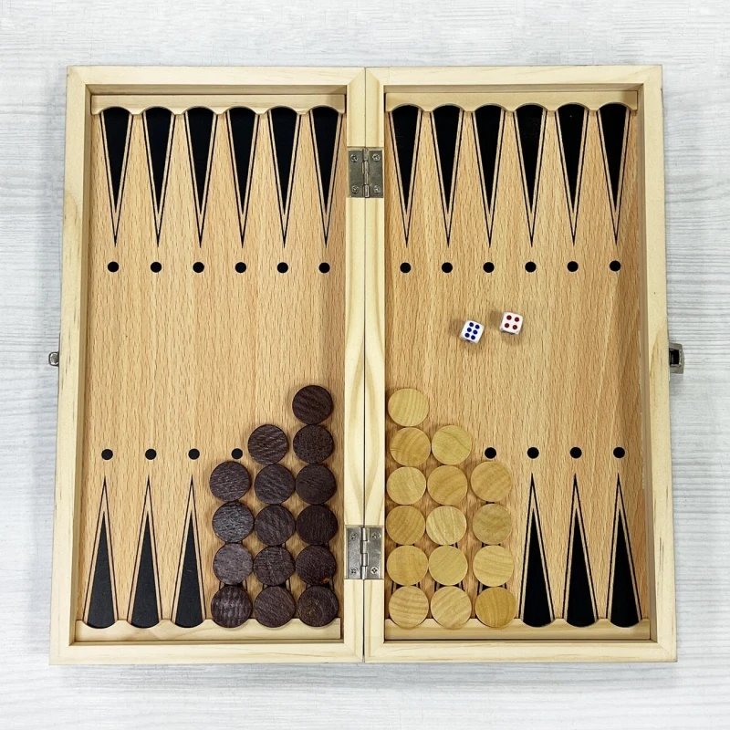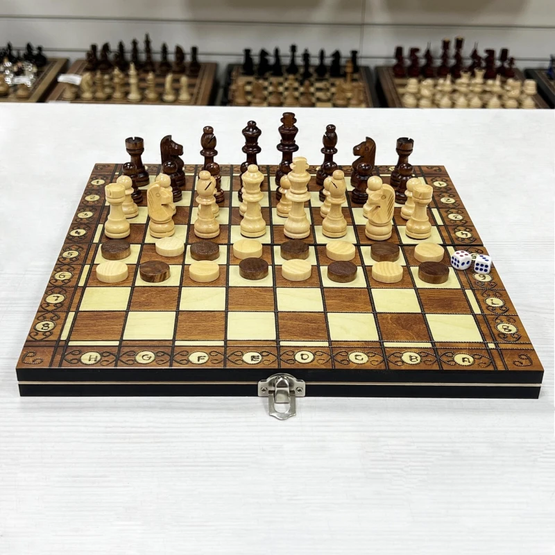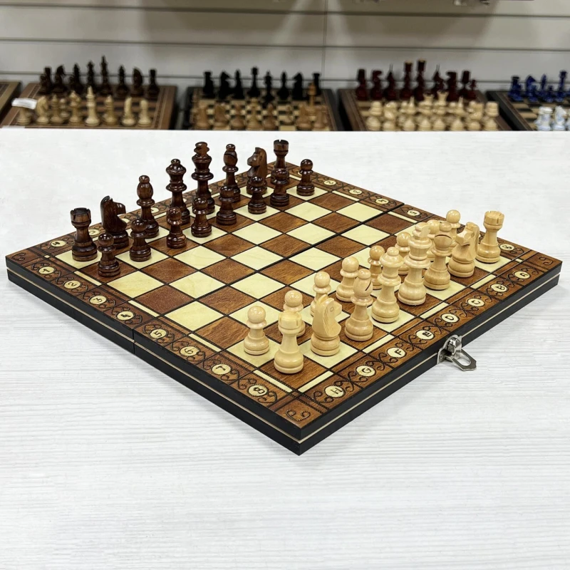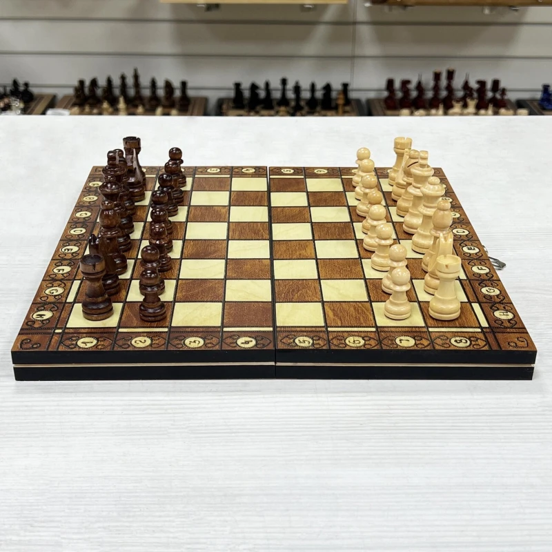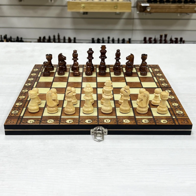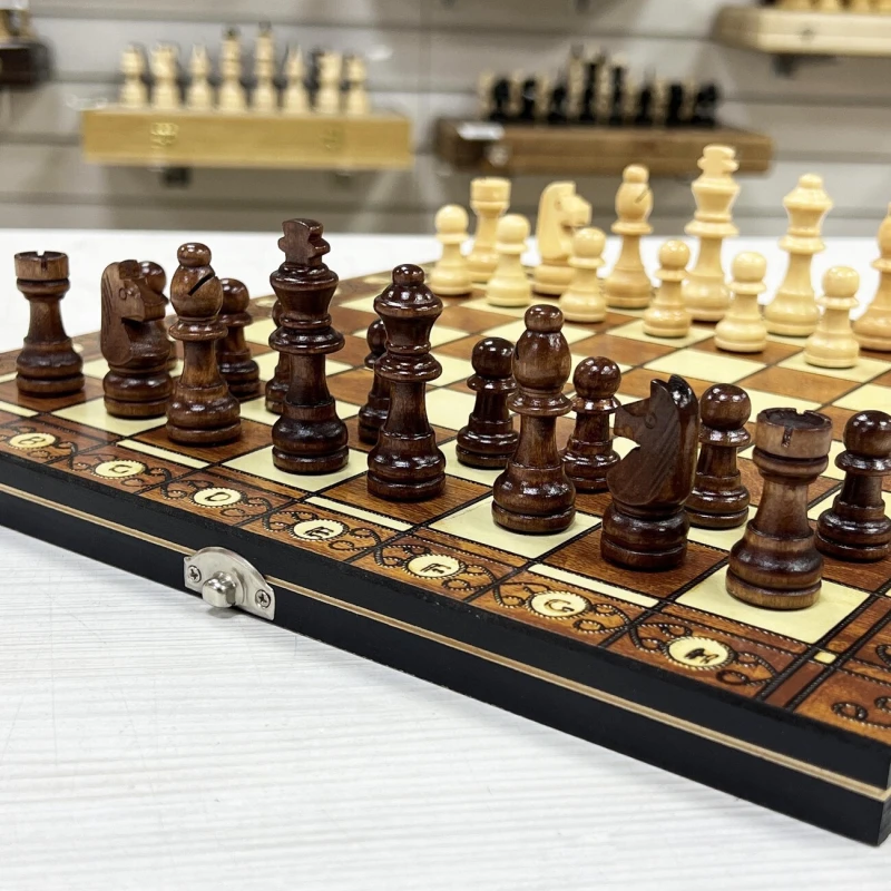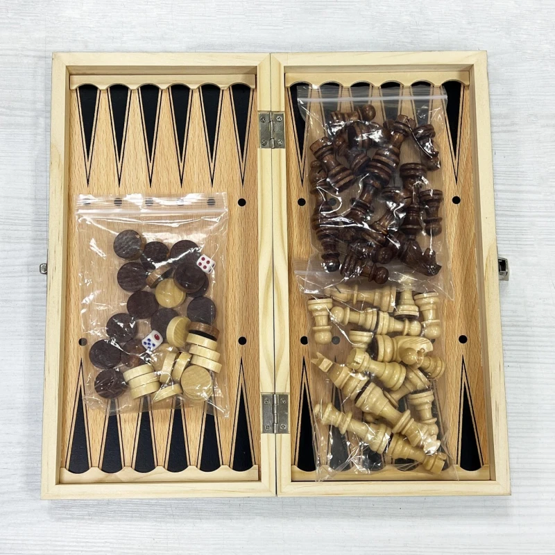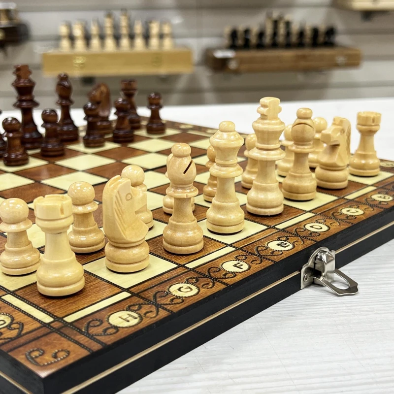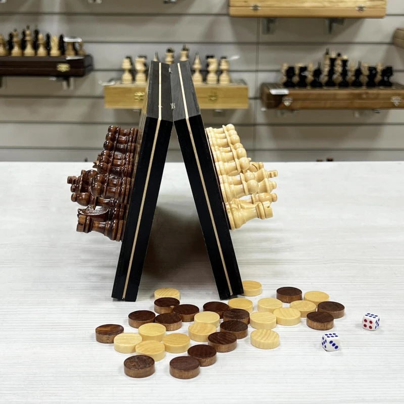 Деревянные шахматы с нардами небольшого размера. Идеальный дорожный вариант шахмат. Шахматные фигуры сделаны из дерева и на магнитнах. Внутри доски есть поле для игры в нарды. Упакованы в полиграфическую коробку. Сделаны в Китае. Размер доски в разложенном виде 30 на 30 см. В комплетке игральные кости, фишки для нард (они же для шашек) и шахматные фигуры в стиле Стаунтон. Подойдут в подарок для детей и взрослых.