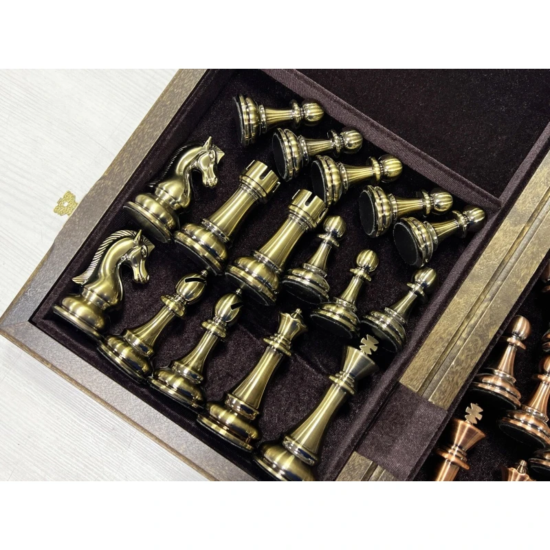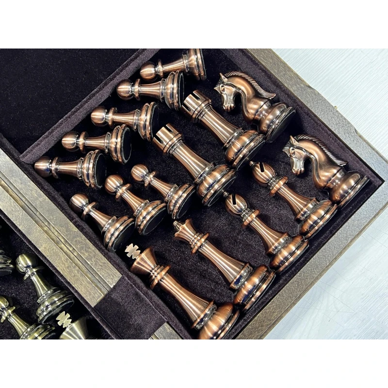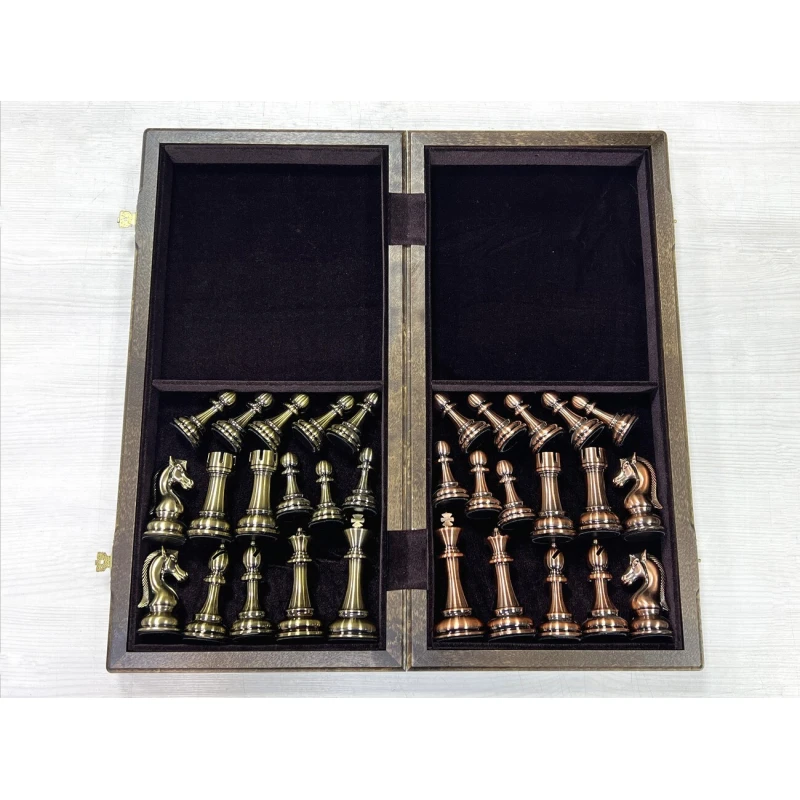 Шахматы подарочные турнирные из ценной породы дерева американского ореха в большом размере 50 х 50 см, размер кледки - 5 см. Доска шахматная складная, отделана бархатов внутри. Доска с высококачественной фурнитурой. Шахматные фигуры в комплекте в стиле "Антик" из высококачественного композита в цвете "под металл".