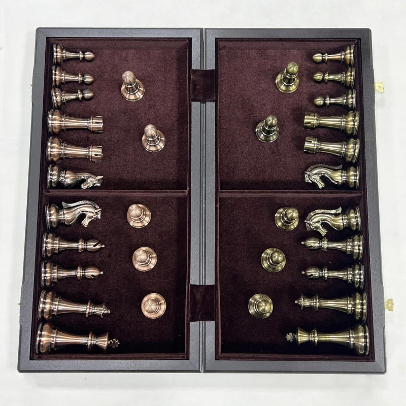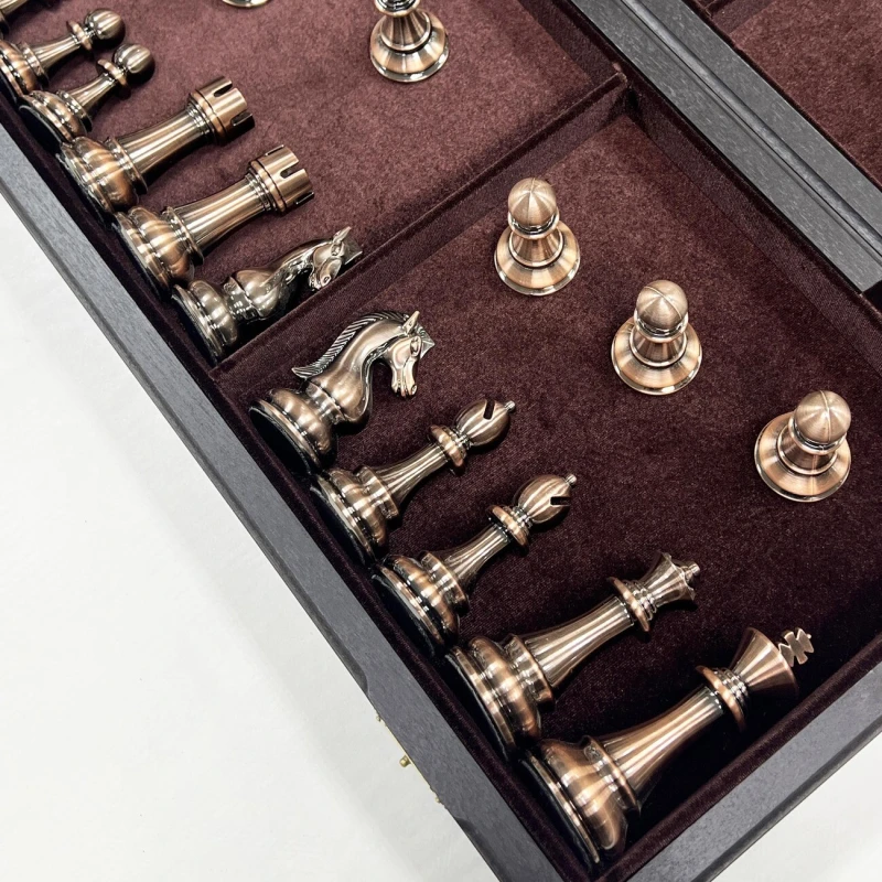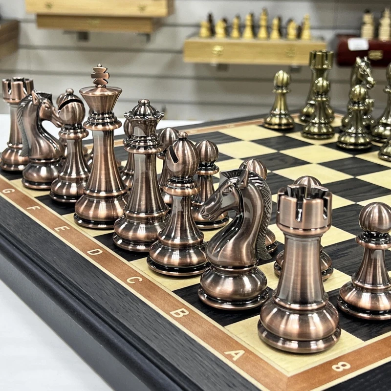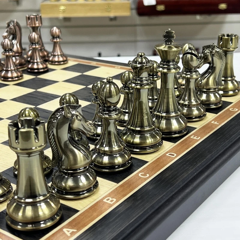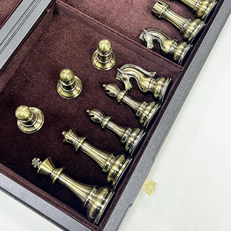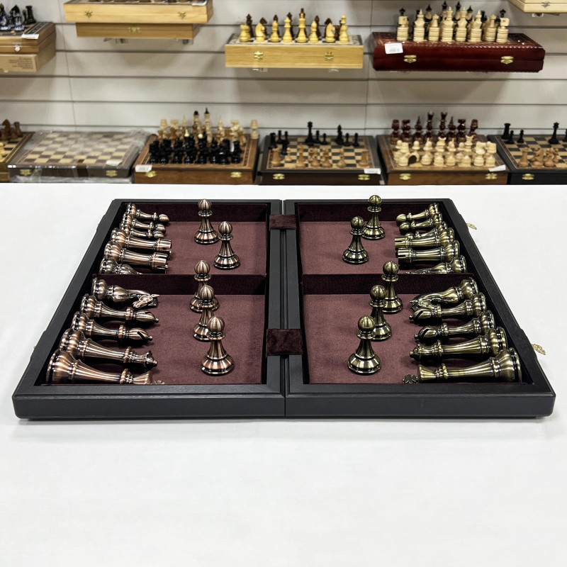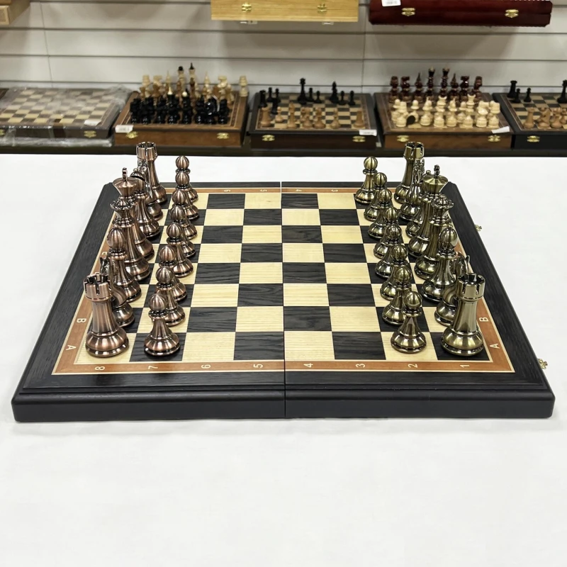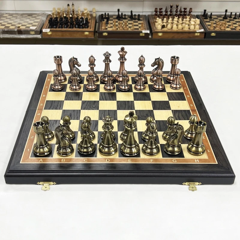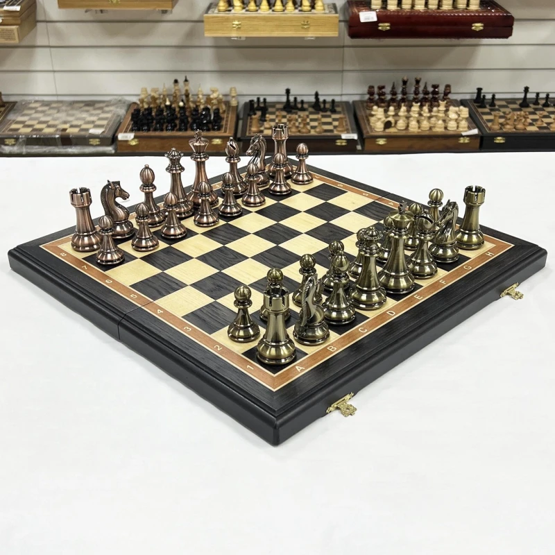 Шахматы подарочные турнирные из ценной породы дерева мореного дуба в большом размере 50 х 50 см, размер кледки - 5 см. Доска шахматная складная, отделана бархатов внутри. Доска с высококачественной фурнитурой. Шахматные фигуры в комплекте в стиле "Антик" из высококачественного композита в цвете "под металл".