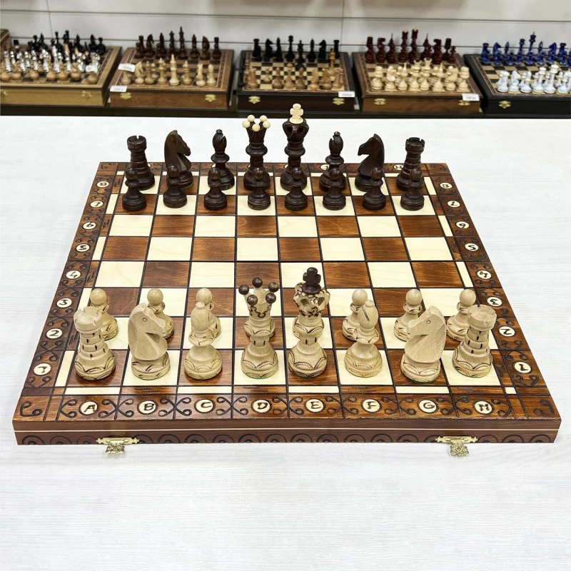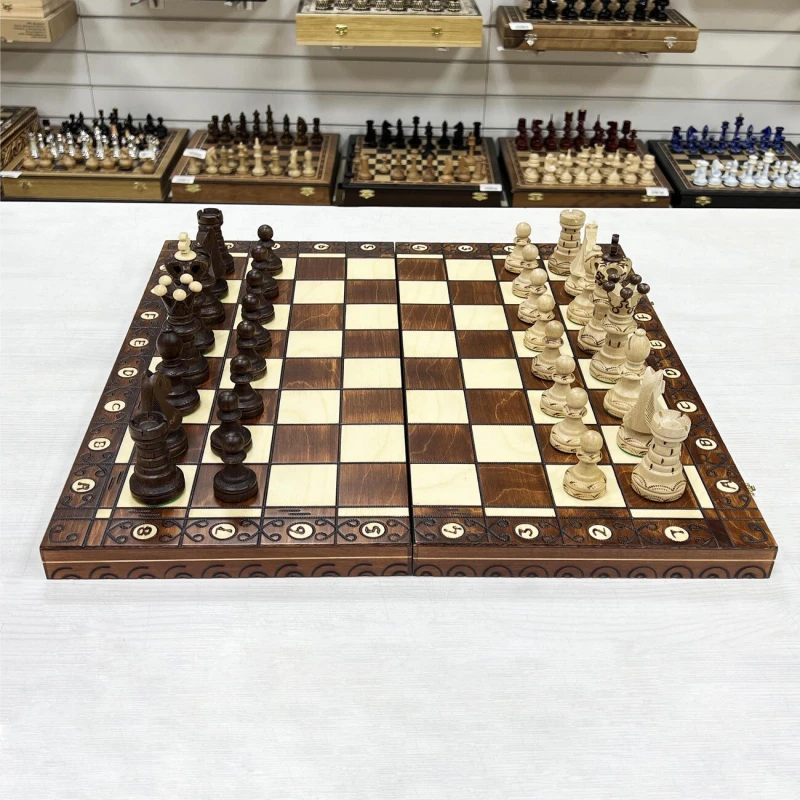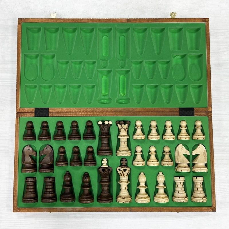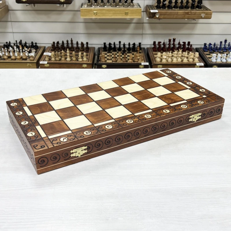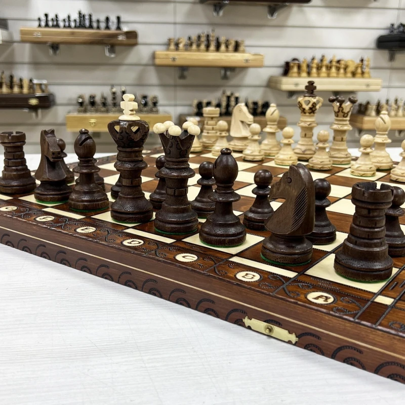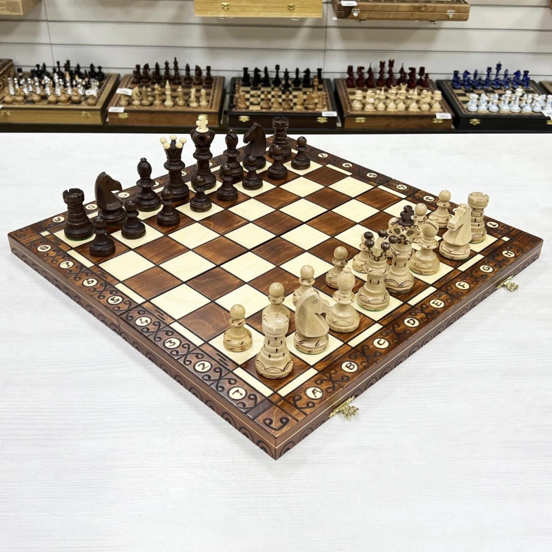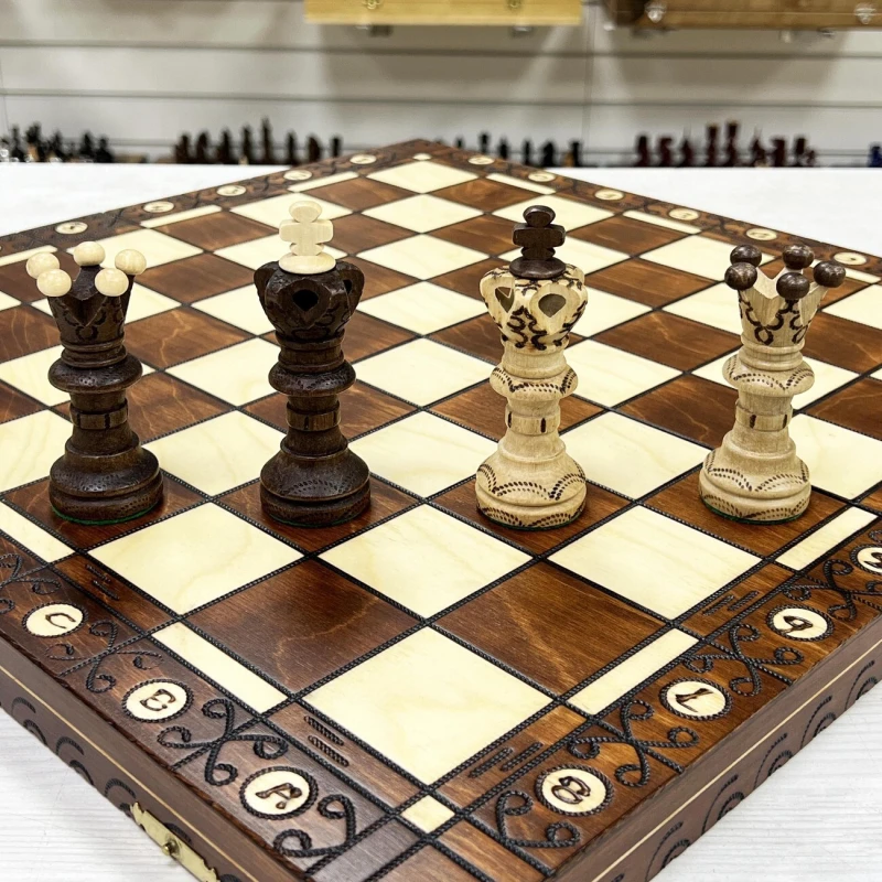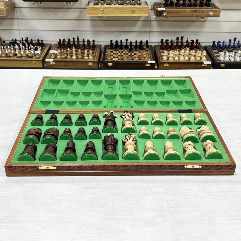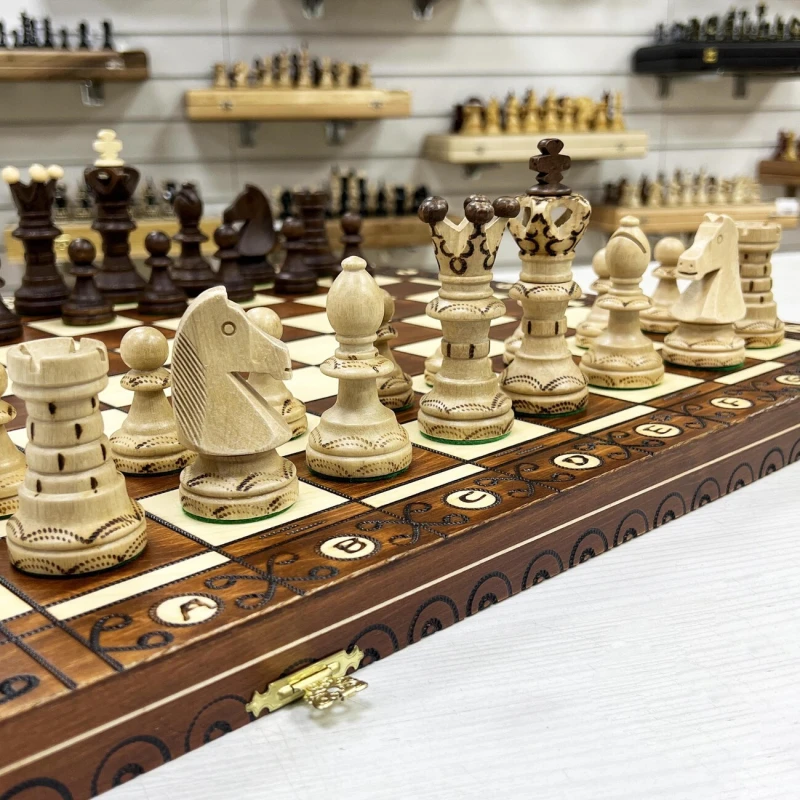 Одна из самых популярных моделей шахмат из дерева в своем ценовом сегменте. Размер доски достаточно большой 52 на 52 см в разложенном виде. Внутри доски есть ячейки для хранения фигур. В основании фигур есть подклейка, что бы не царапать доску. Подойдут в подарок для детей и взрослых. Высота короля 11 см, высота пешки 5 см. Размер клетки 5 на 5 см. Шахматное поле сделано с помощью выжигания по дереву. Фигуры с утяжелением и схожи по дизайну с классическими Стаунтон, но при этом имеют свою уникальность. Подойдут для начинающих игроков и опытных профессионалов.