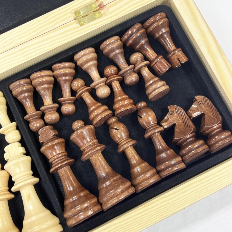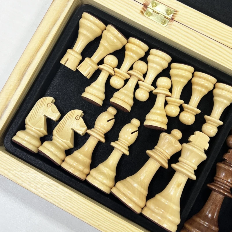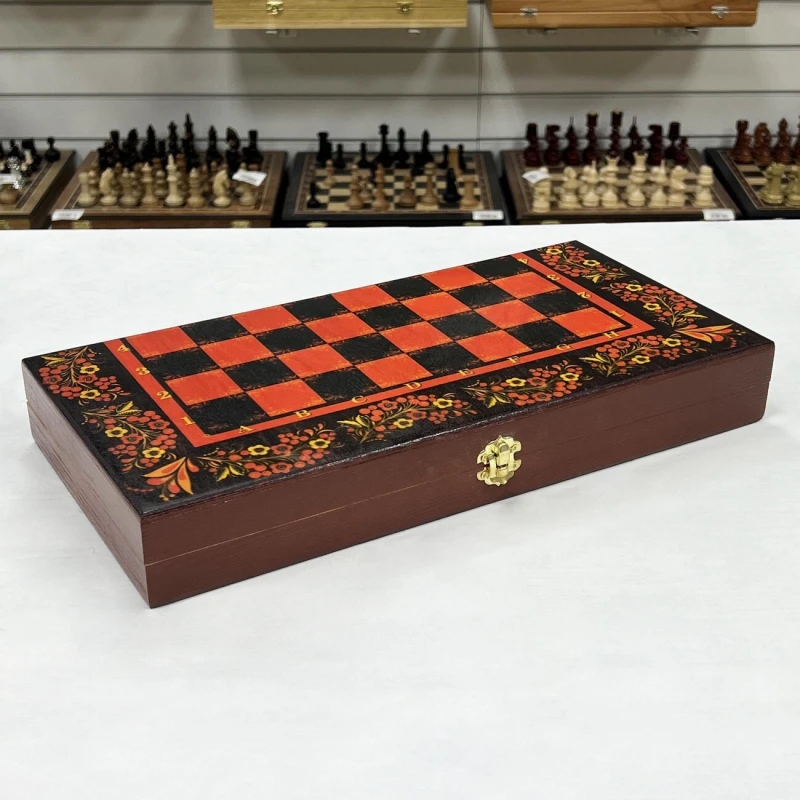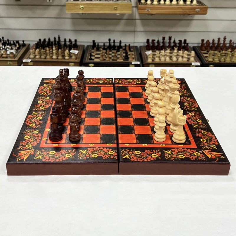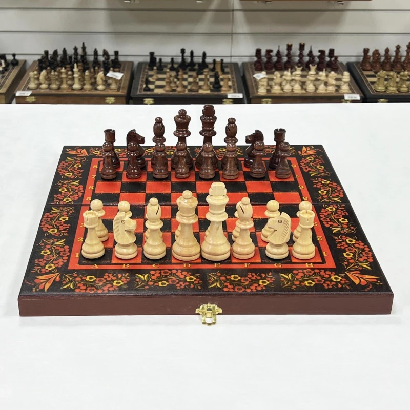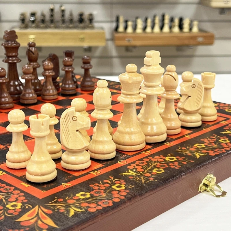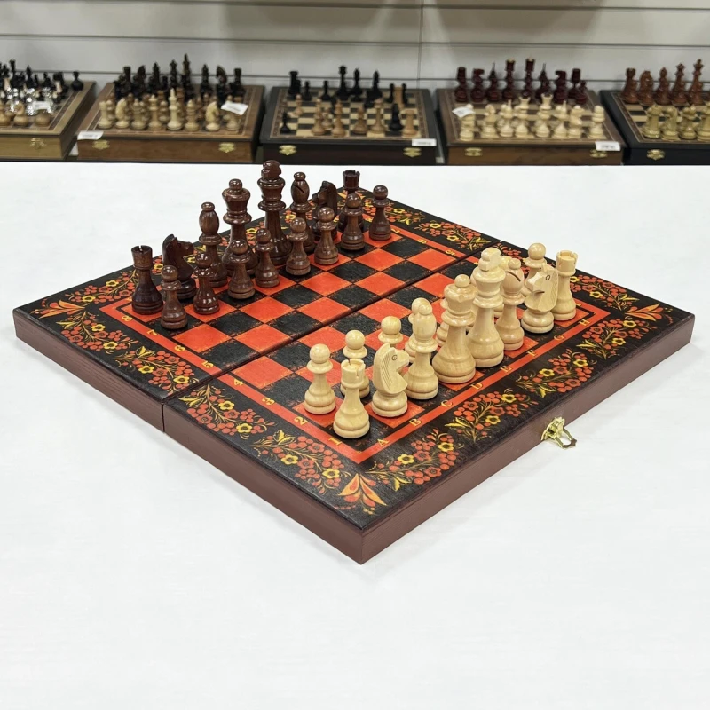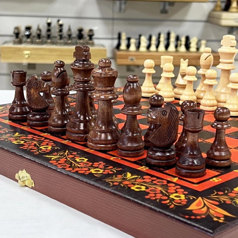 Деревянные шахматы с росписной доской в стиле Хохлома. В наборе шахматные фигуры из дерева в классическом стиле Стаунтон. Внутри 2 отсека для хранения фигур. Размер доски в разложенном виде 40 на 40 см. Подойдут в подарок для иностранцев, для детей и взрослых. Высота короля 9 см.