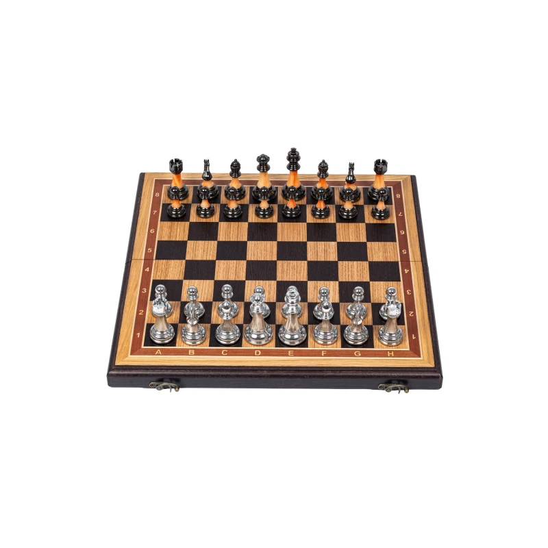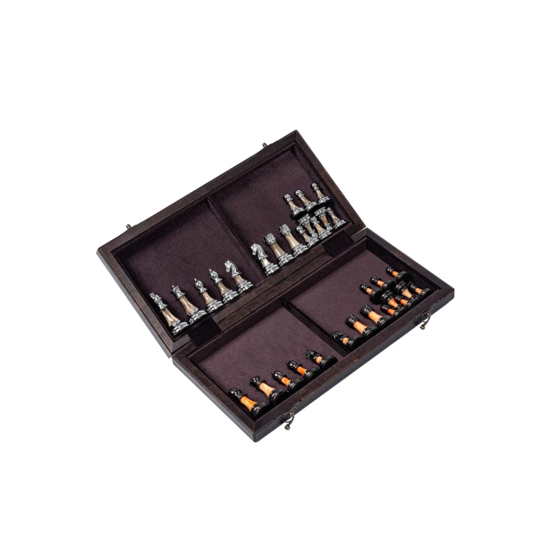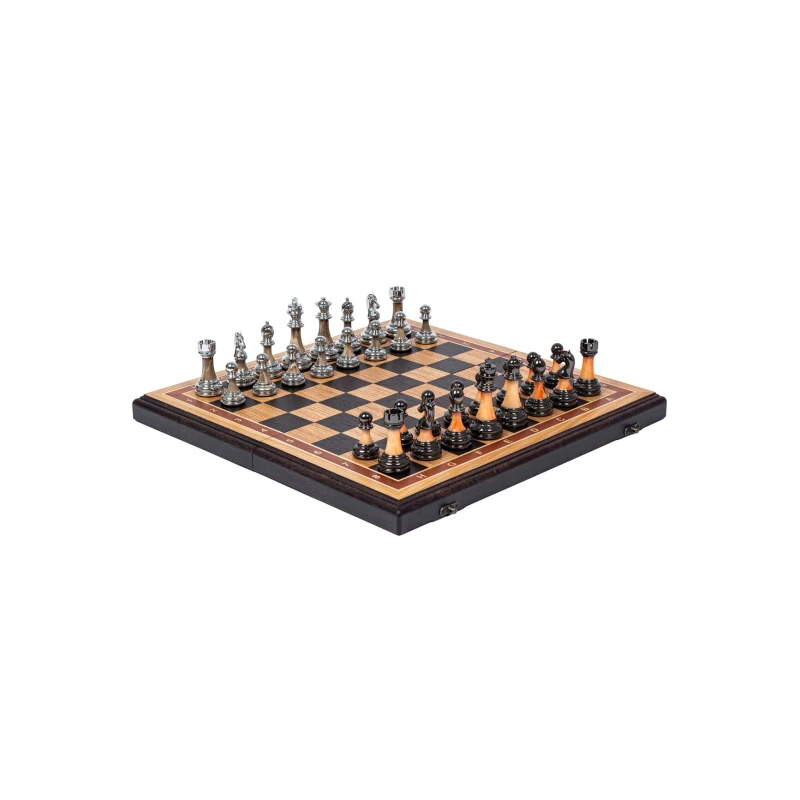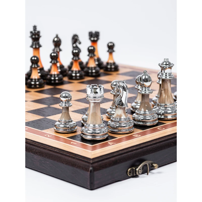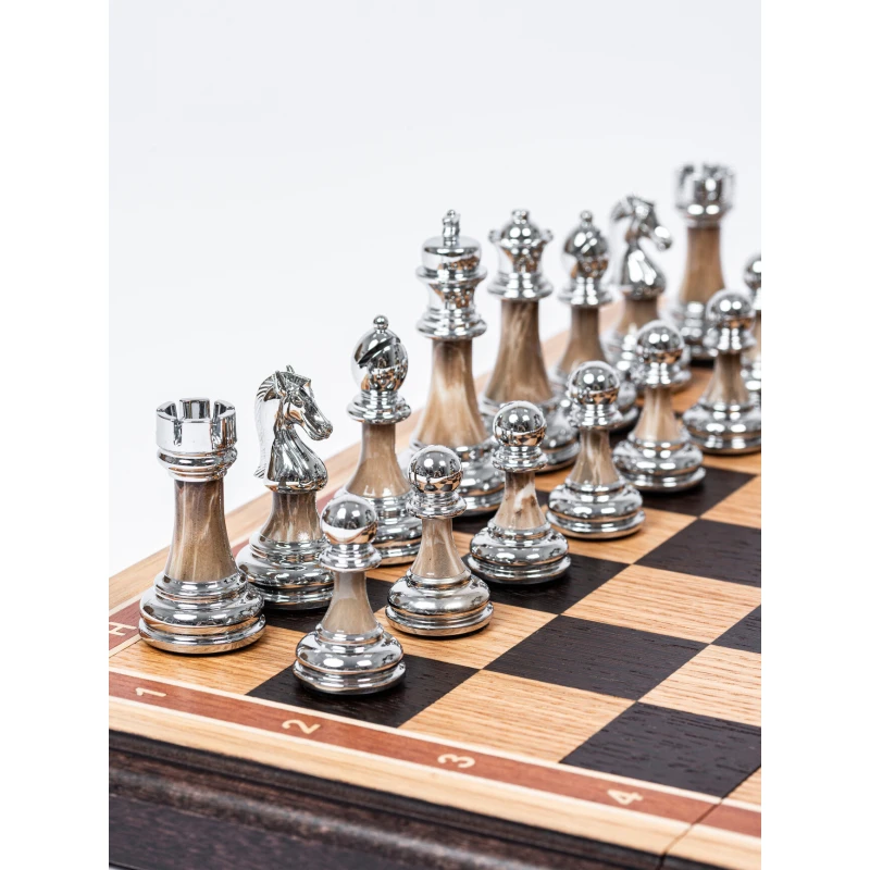 Шахматы Итальянский дизайн из дуба сделаны в классическом стиле, но при этом имеют оригинальный дизайн. Фигуры сделаны с утяжелением для повышенной устойчивости. Размер доски от края до края 45 на 45 см в развернутом виде. Высота короля 9 см, высота пешки 5 см. Размер клетки 4.5 на 4.5 см. Шахматное поле собирается вручную из ценных пород дерева. Темная клетка венге, светлая дуб.