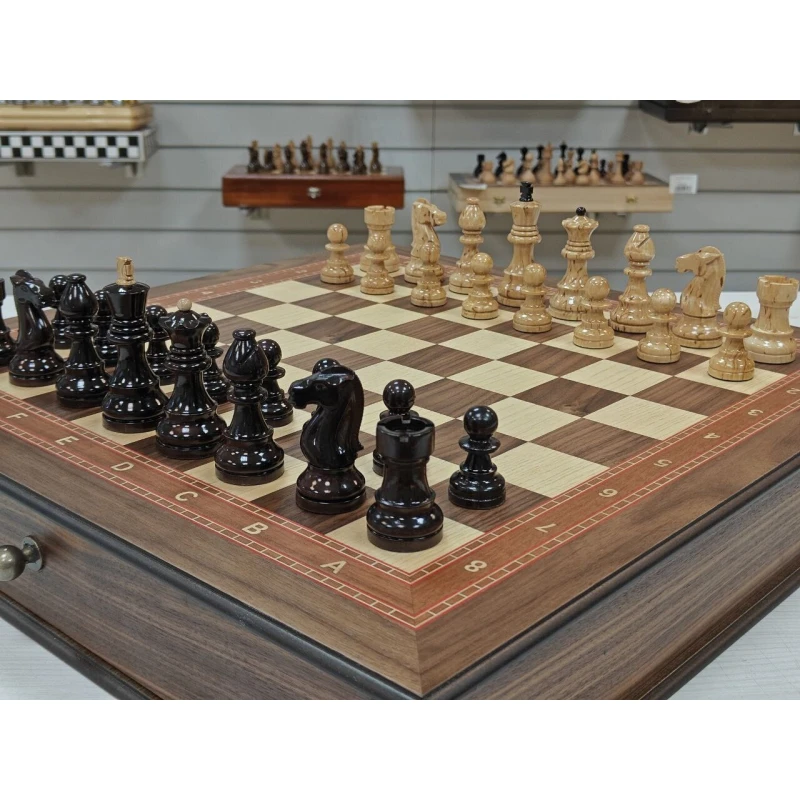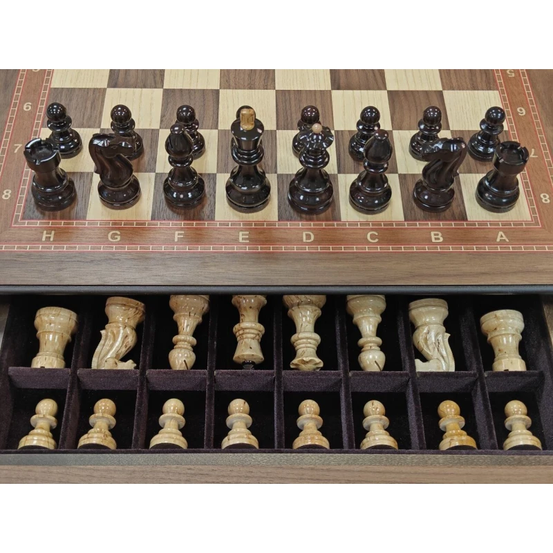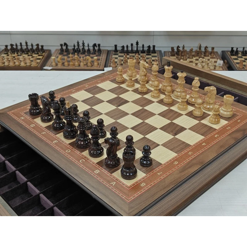 Большие подарочные шахматы ручной работы из ценных пород дерева. В доске есть 2 выдвижных ящика с ячейками для хранения фигур, покрыты бархатом. Размер клетки 4.5 на 4.5 см. Материал доски орех, ясень. Материал фигур карельская береза. Шахматные фигуры покрыты рояльным лаком. Сделаны в России. Подойдут в качестве подарка для взрослых и детей.