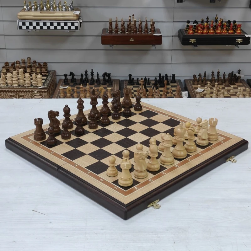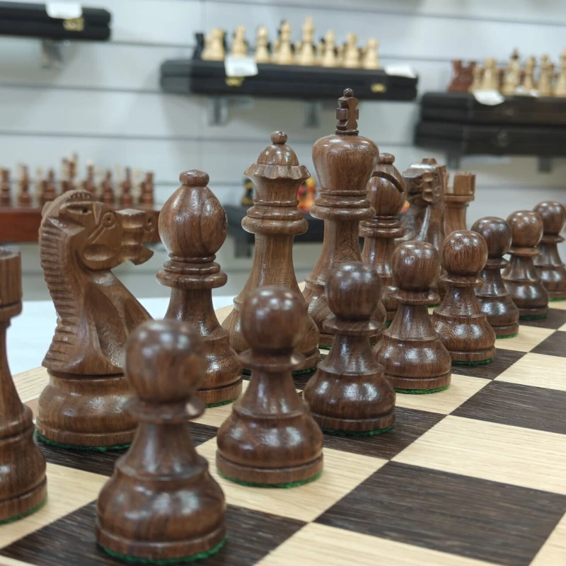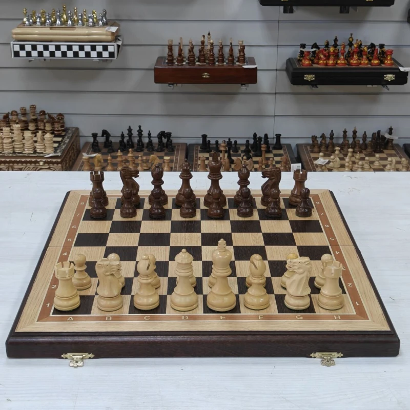 Шахматы подарочные из ценных пород дерева. Размер доски 50х50см клетка - 5см. Доски производятся в России, материал доски венге и дуб, внутри покрыта бархатом для безопасного хранения фигур. Фигуры из Индии изготавливаются из самшита и палисандра. Доска и фигуры ручной работы.