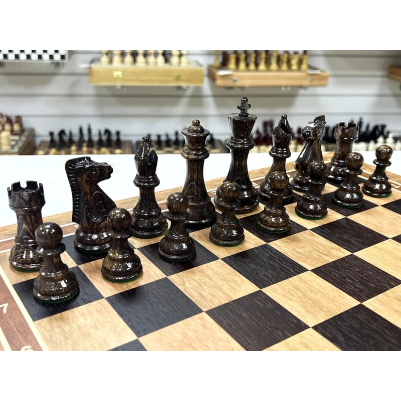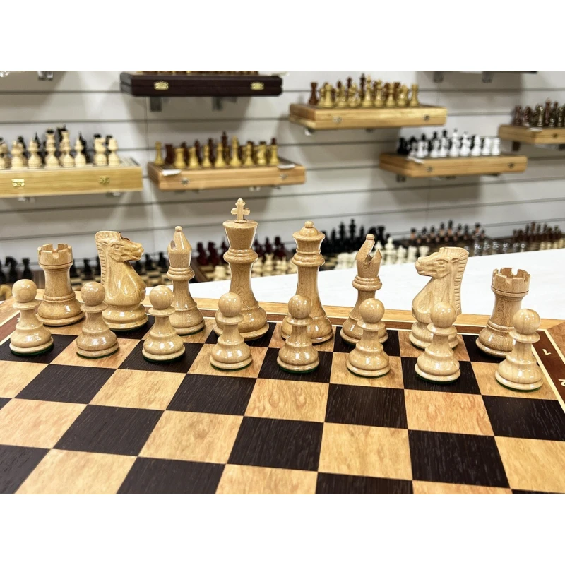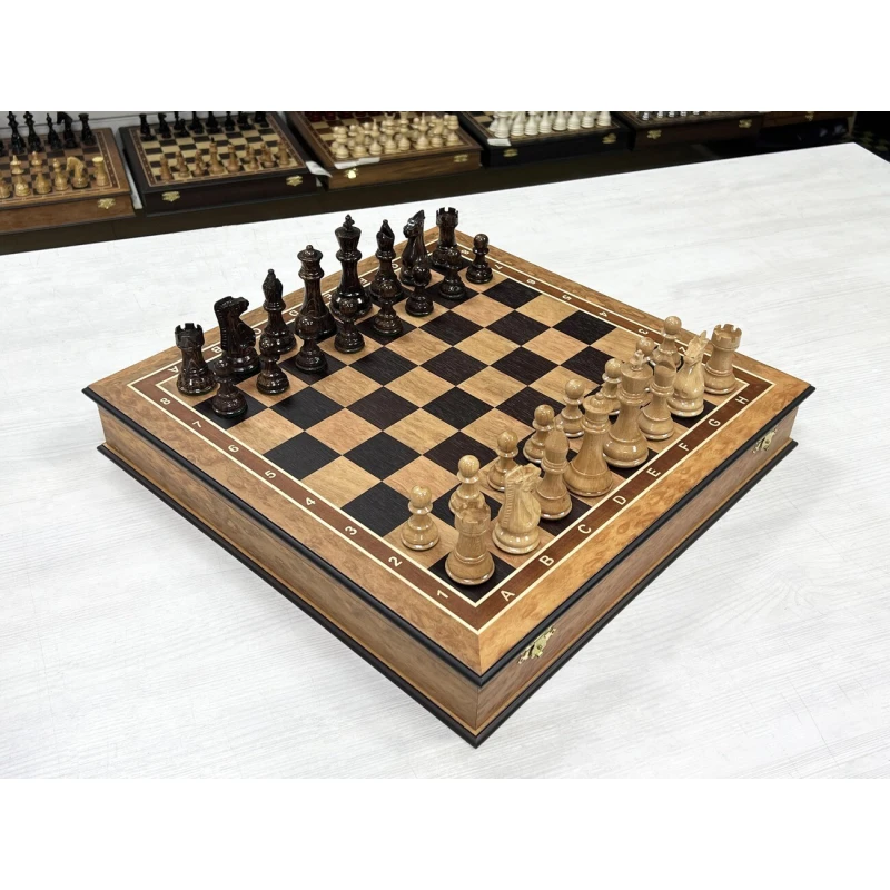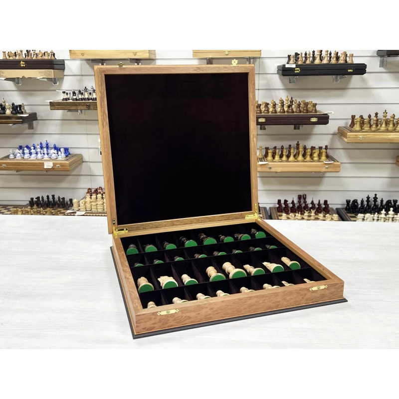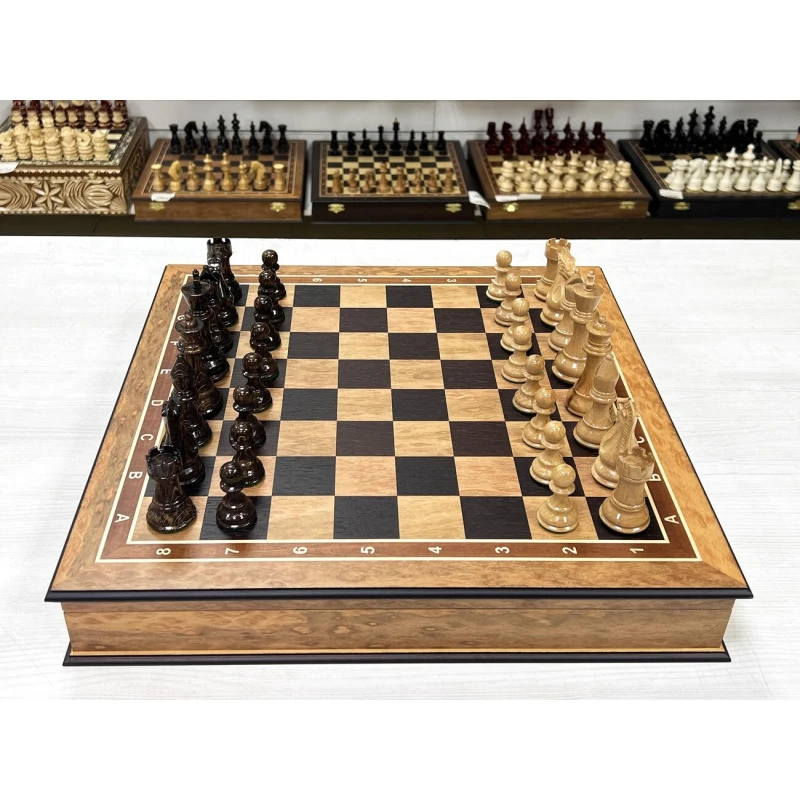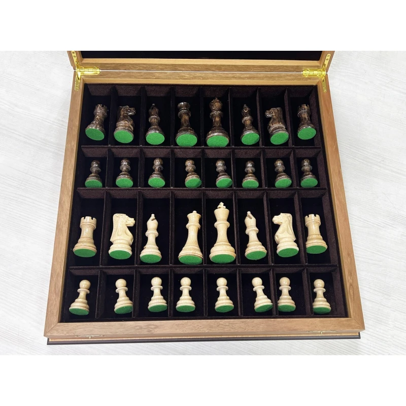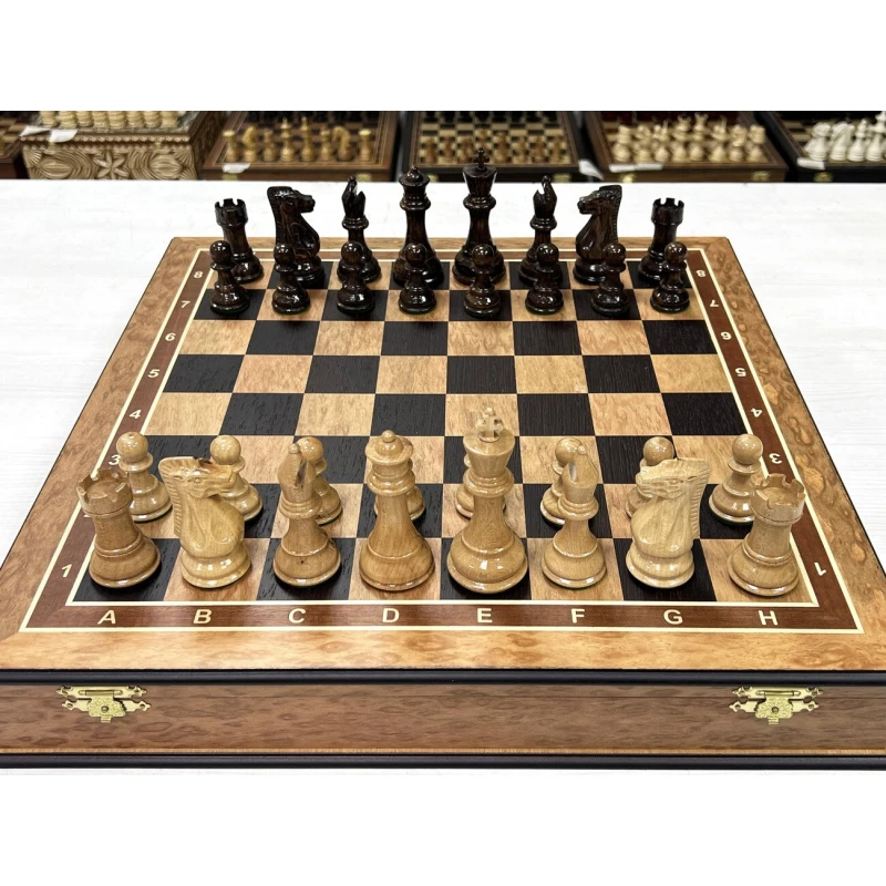 Подарочный шахматный ларец выполненный из эвкалипта с фигурами Стаунтон из дуба и клена. Ларец и фигуры изготавливаются вручную российскими мастерами. Отличная идея для подарка всем любителям и профессионалам игры в шахматы. Доска имеет размеры 45х45 см, клетка 4.5см, высота короля 10 см, высота пешки 5 см. Ларец имеет индивидуальные ячейки для безопасного и удобного хранения фигур.