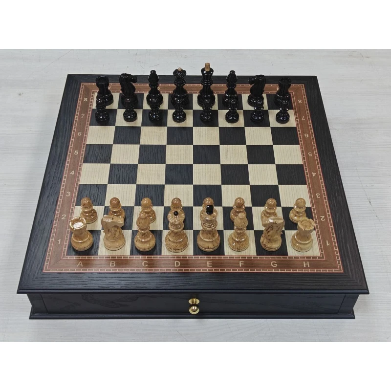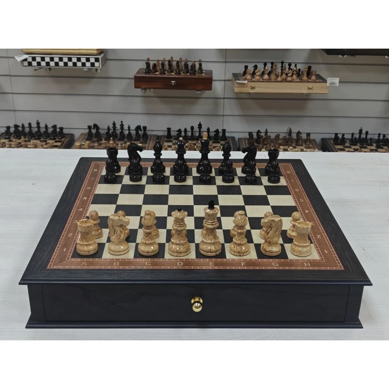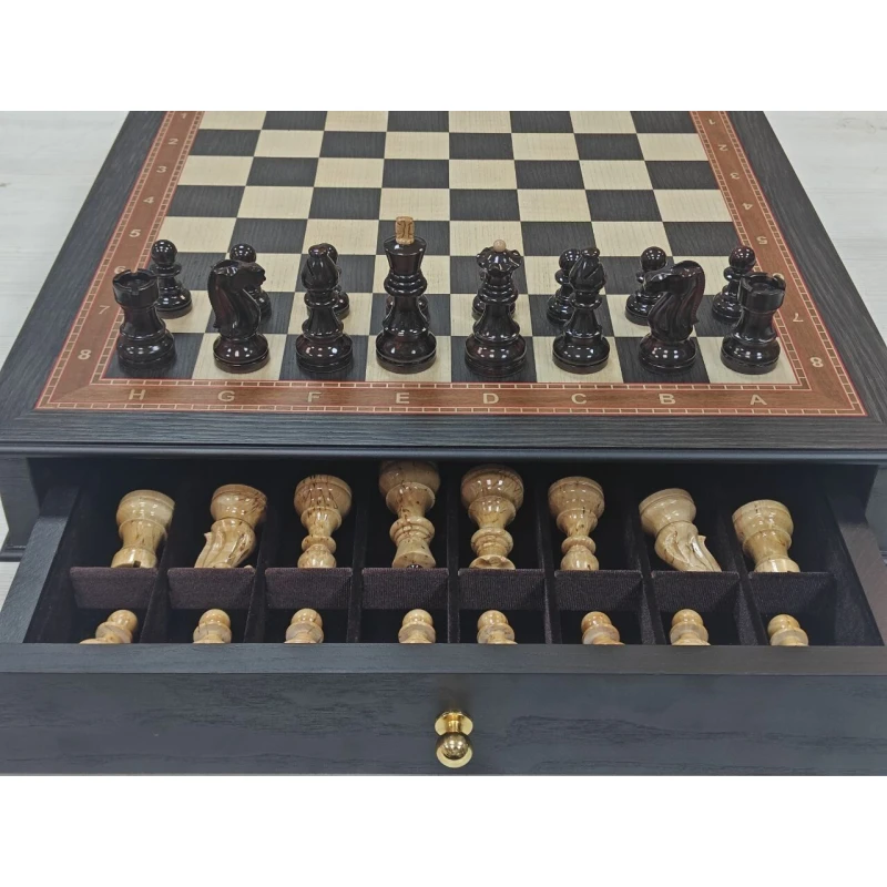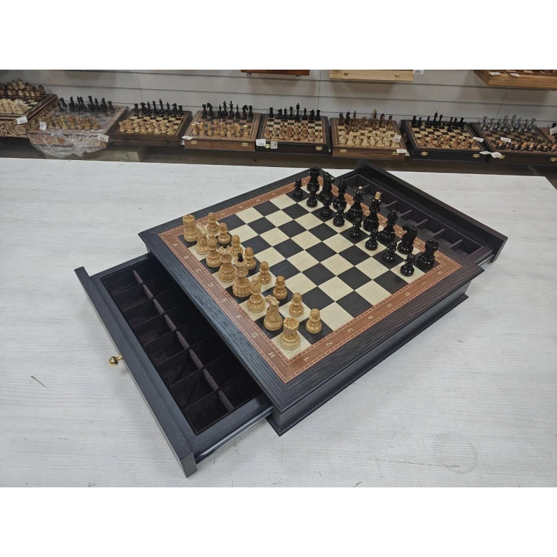 Шахматное поле собирается вручную из моренного дуба, ясеня и красного дерева. У доски есть выдвижные ящики для бережного хранения шахматных фигур.